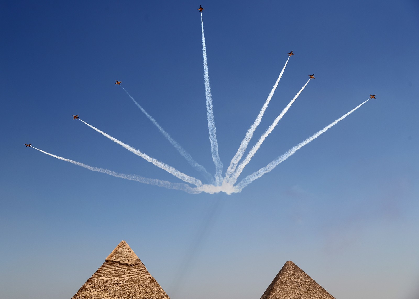 當(dāng)日,埃及2022金字塔航空表演在吉薩金字塔景區(qū)舉行,來自埃及和韓國的多個(gè)飛行表演隊(duì)伍進(jìn)行了多項(xiàng)精彩的飛行表演。