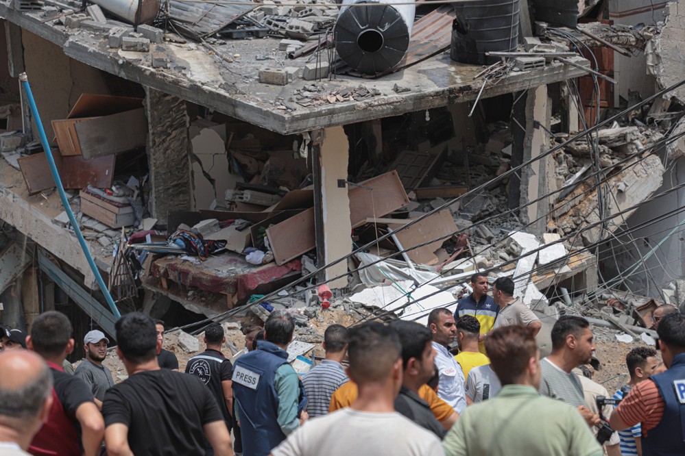 8月6日,加沙城遭遇空襲后,人們查看損毀的樓房。