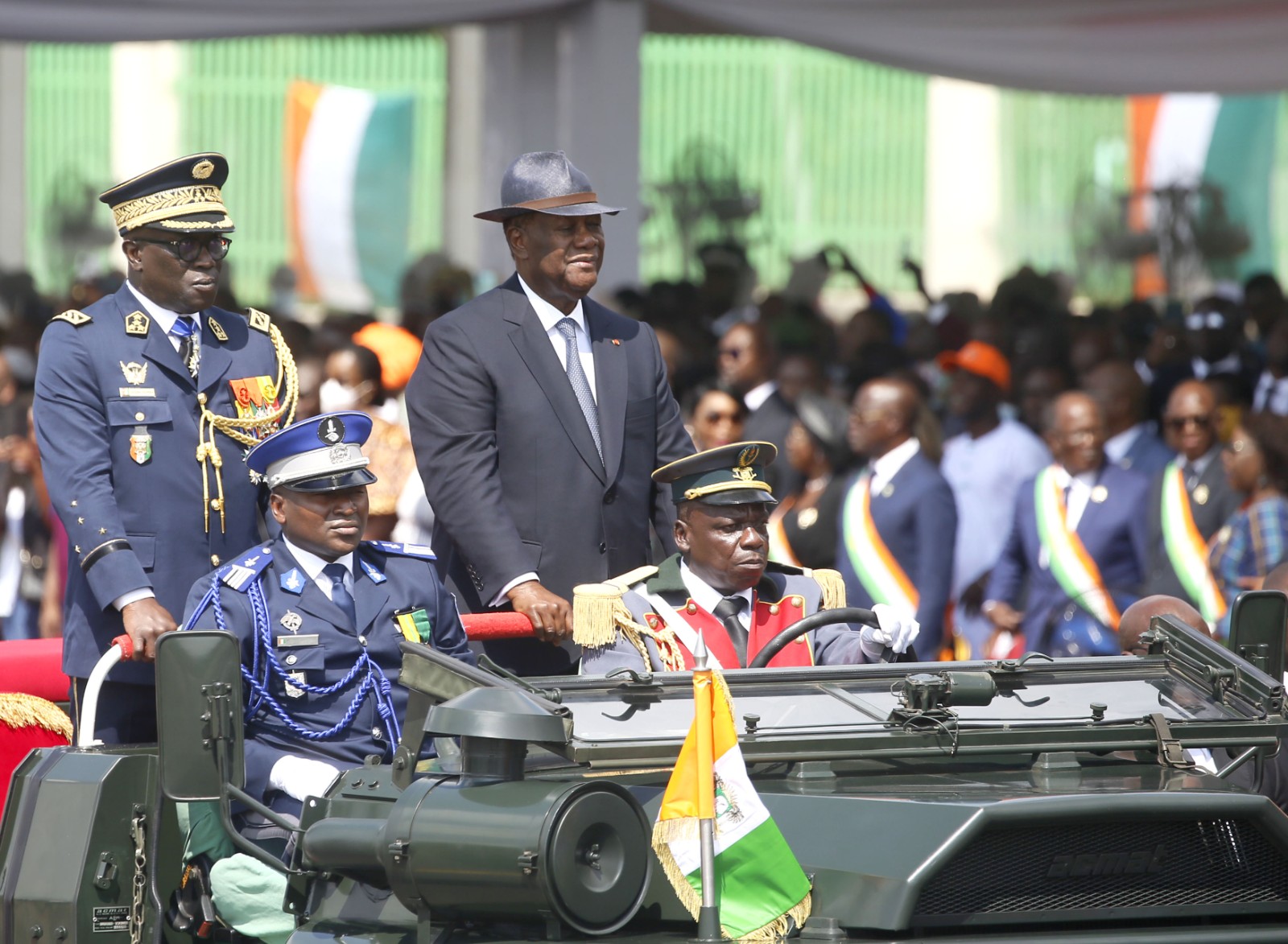 8月7日,在科特迪瓦亞穆蘇克羅,總統(tǒng)瓦塔拉(左三)出席獨(dú)立日閱兵儀式。