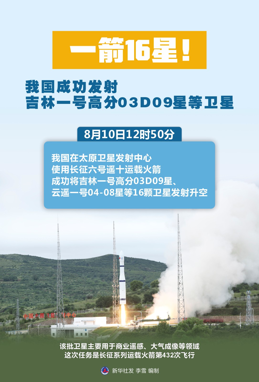 8月10日12時(shí)50分,我國在太原衛(wèi)星發(fā)射中心使用長征六號(hào)遙十運(yùn)載火箭,成功將吉林一號(hào)高分03D09星、云遙一號(hào)04-08星等16顆衛(wèi)星發(fā)射升空,衛(wèi)星順利進(jìn)入預(yù)定軌道,發(fā)射任務(wù)獲得圓滿成功。