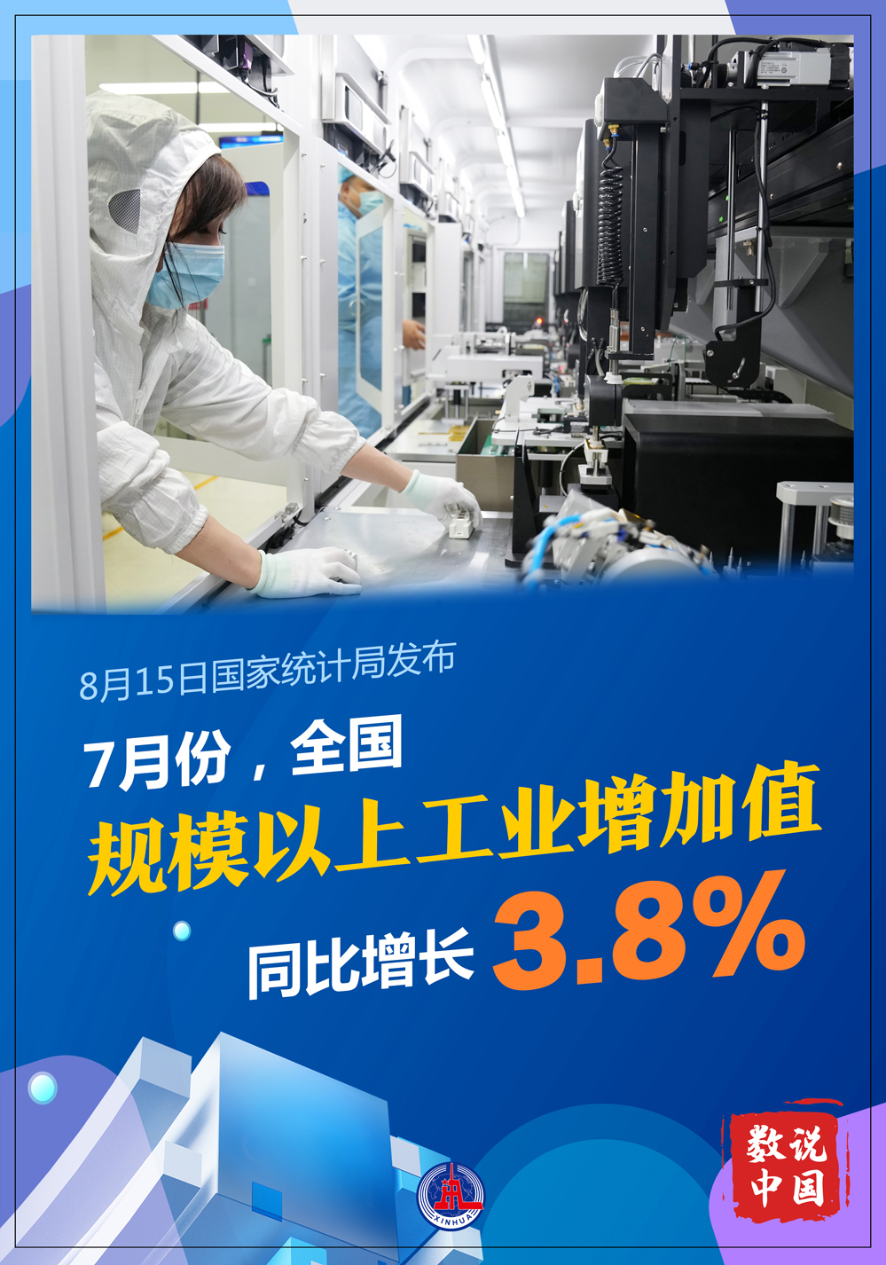 國家統(tǒng)計(jì)局8月15日發(fā)布數(shù)據(jù)顯示,7月份,全國規(guī)模以上工業(yè)增加值同比增長3.8%,比上月回落0.1個(gè)百分點(diǎn);環(huán)比增長0.38%。