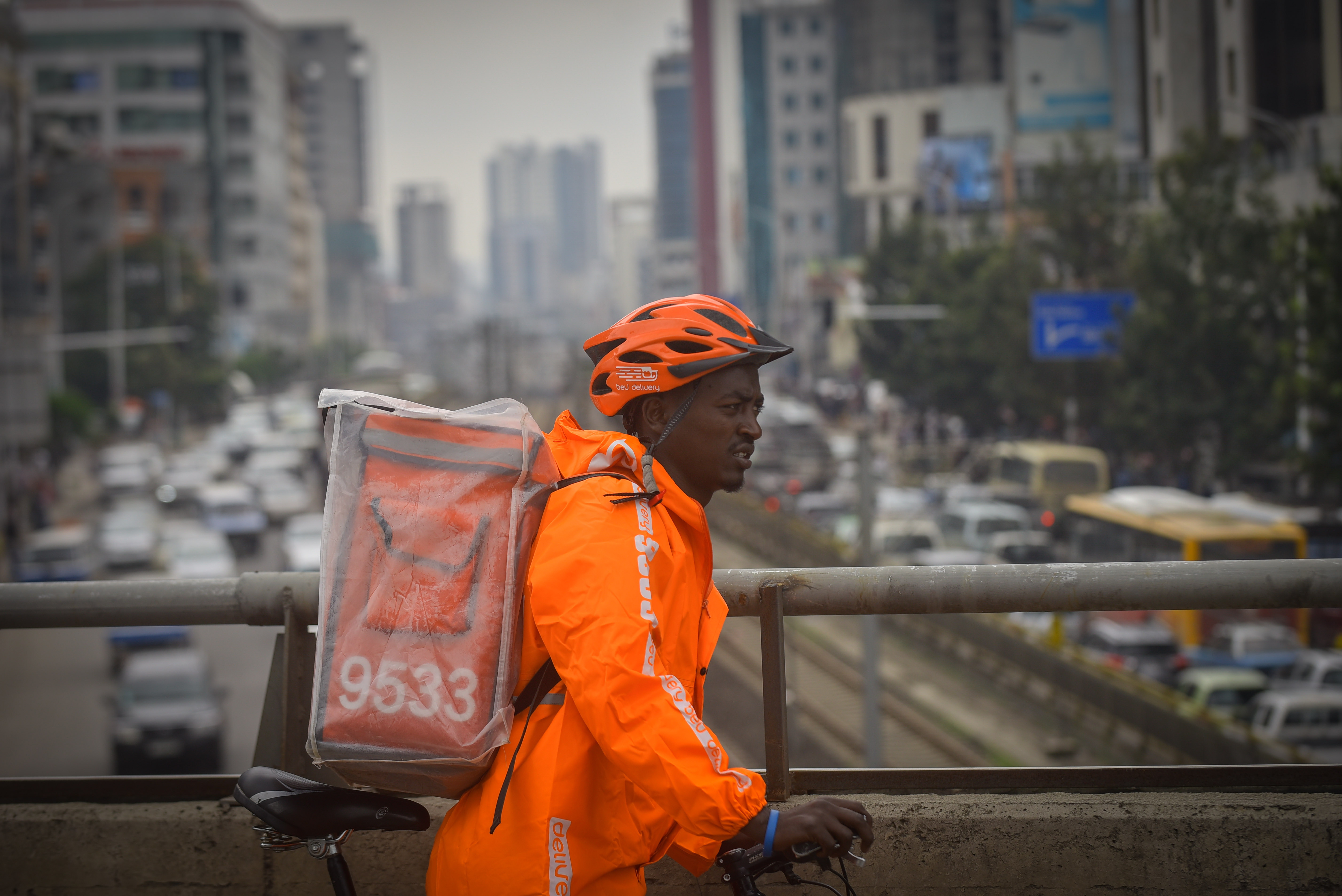 7月19日,外賣騎手阿斯納克·尼古西在埃塞俄比亞首都亞的斯亞貝巴街道上送餐。