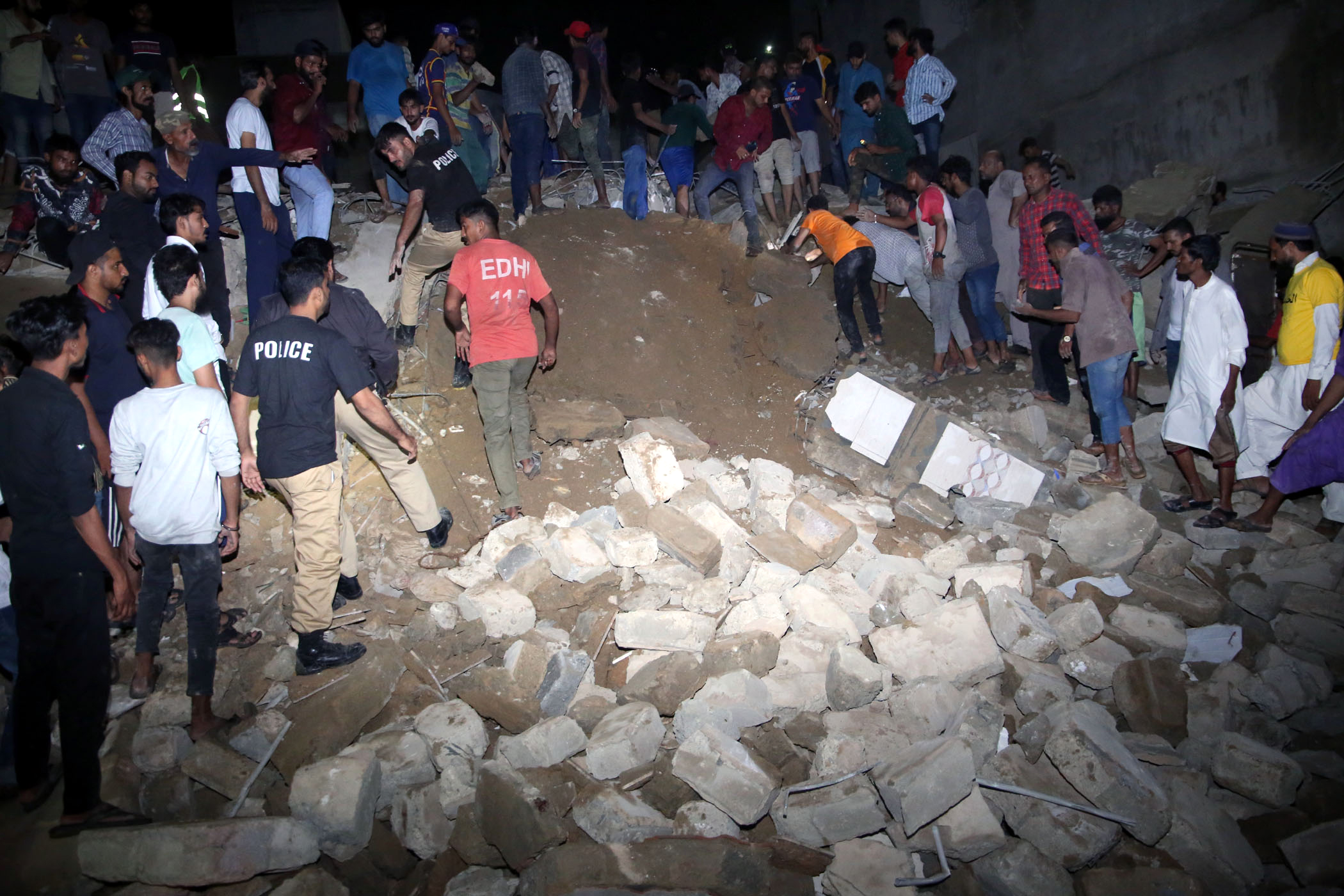 8月16日凌晨,人們?cè)诎突固箍ɡ娼ㄖ顾F(xiàn)場(chǎng)搜尋幸存者。