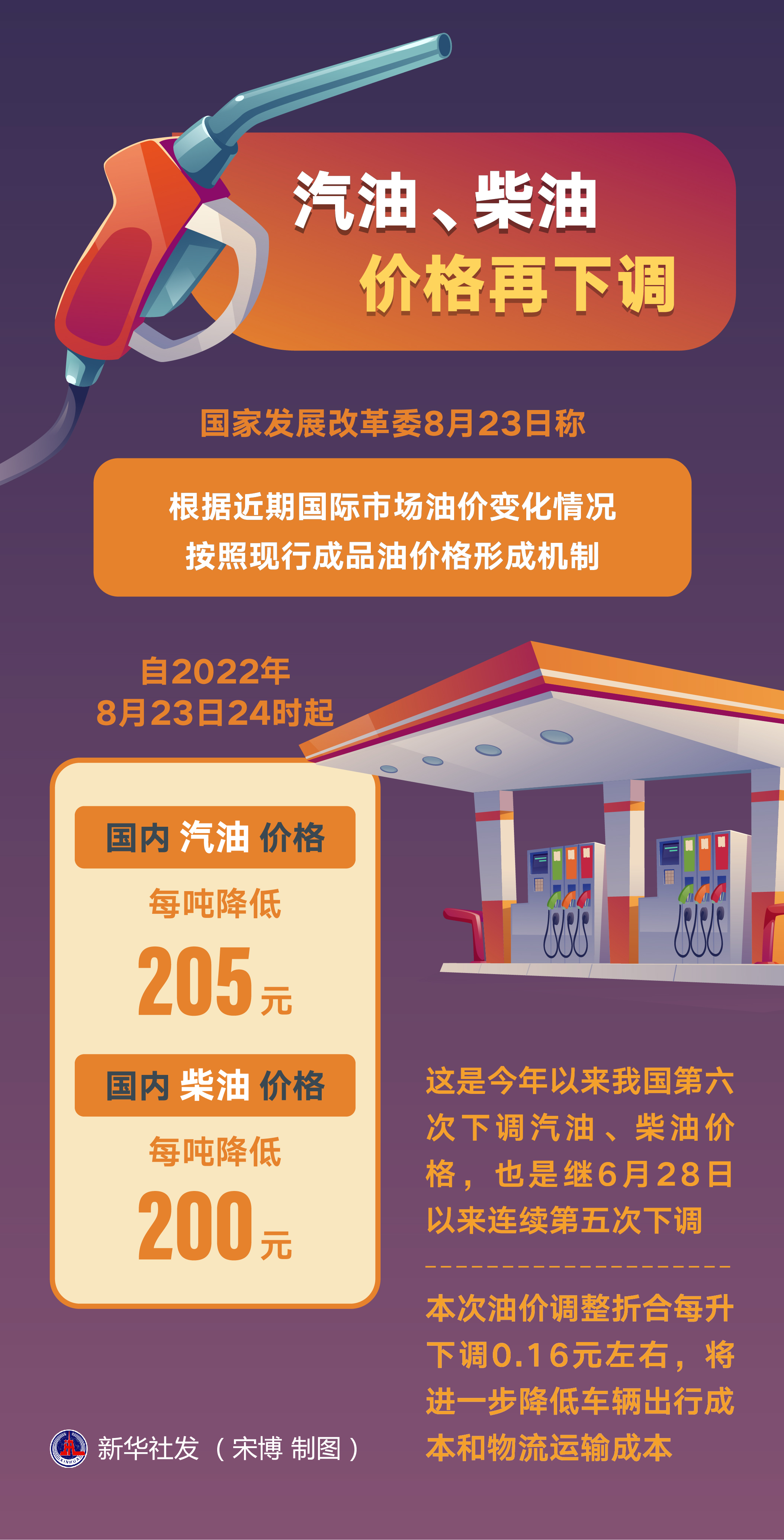 國家發(fā)展改革委8月23日稱,根據(jù)近期國際市場油價變化情況,按照現(xiàn)行成品油價格形成機制,自2022年8月23日24時起,國內(nèi)汽油、柴油價格每噸分別降低205元和200元。