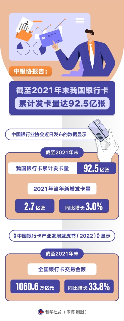 中國銀行業(yè)協會近日發(fā)布的數據顯示,截至2021年末,我國銀行卡累計發(fā)卡量達92.5億張,2021年當年新增發(fā)卡量2.7億張,同比增長3.0%。