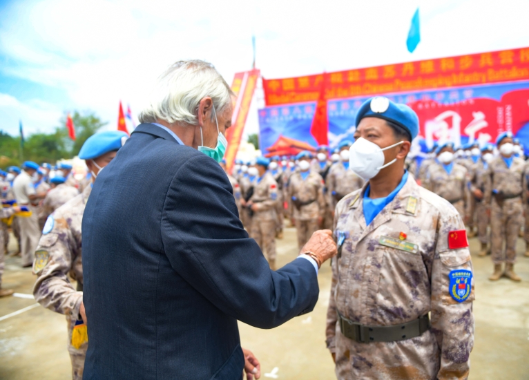 9月30日,在聯(lián)合國駐南蘇丹特派團超級營地,聯(lián)合國秘書長特別代表兼聯(lián)南蘇團團長尼古拉斯·海瑟姆為中國維和官兵授勛。