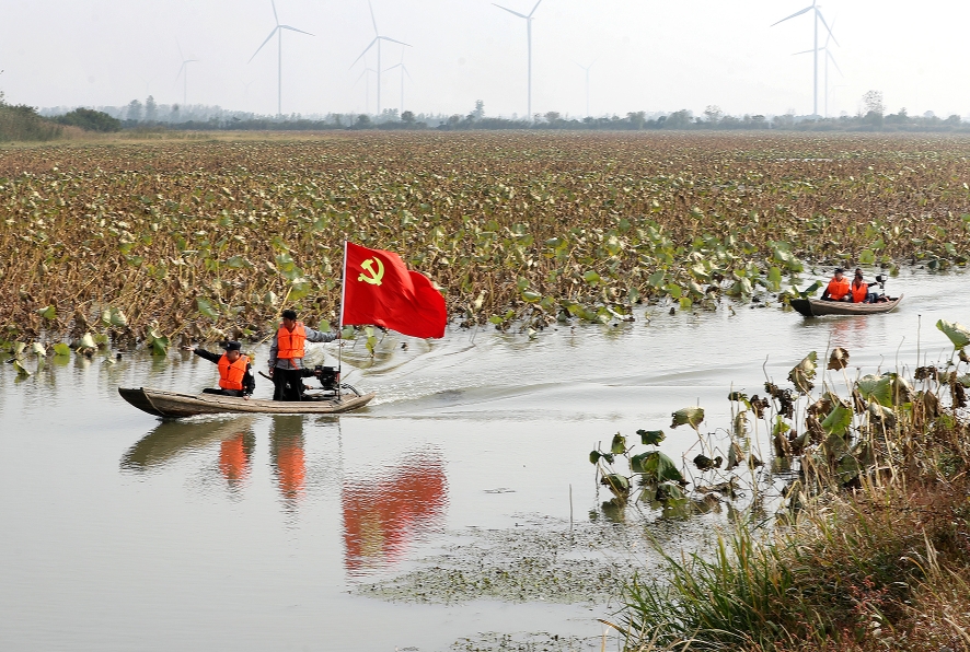 10月31日,在湖北省沙洋縣借糧湖水域,沙洋縣公安局毛李水陸派出所河湖警長與村干部開展生態(tài)保護(hù)例行巡查。今年以來,沙洋縣公安局推進(jìn)河湖警長工作機(jī)制,在漢江、長湖等江河湖泊開展生態(tài)環(huán)境保護(hù)巡查,嚴(yán)厲打擊污染環(huán)境、非法捕撈、非法采砂等違法犯罪,為保護(hù)生態(tài)環(huán)境筑牢法治屏障。