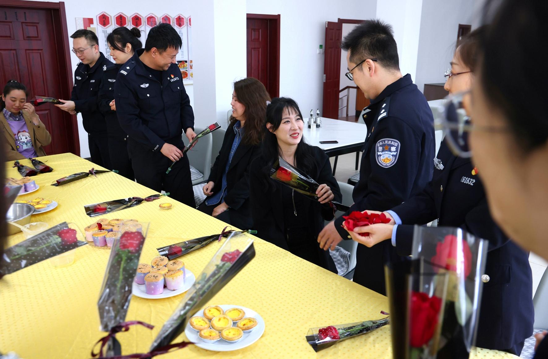 3月7日,浙江省嘉興市公安局南湖區(qū)分局七星派出所女民警走進(jìn)轄區(qū)企業(yè),為女員工們送上帶有反詐小貼紙的“三八”節(jié)祝福鮮花。