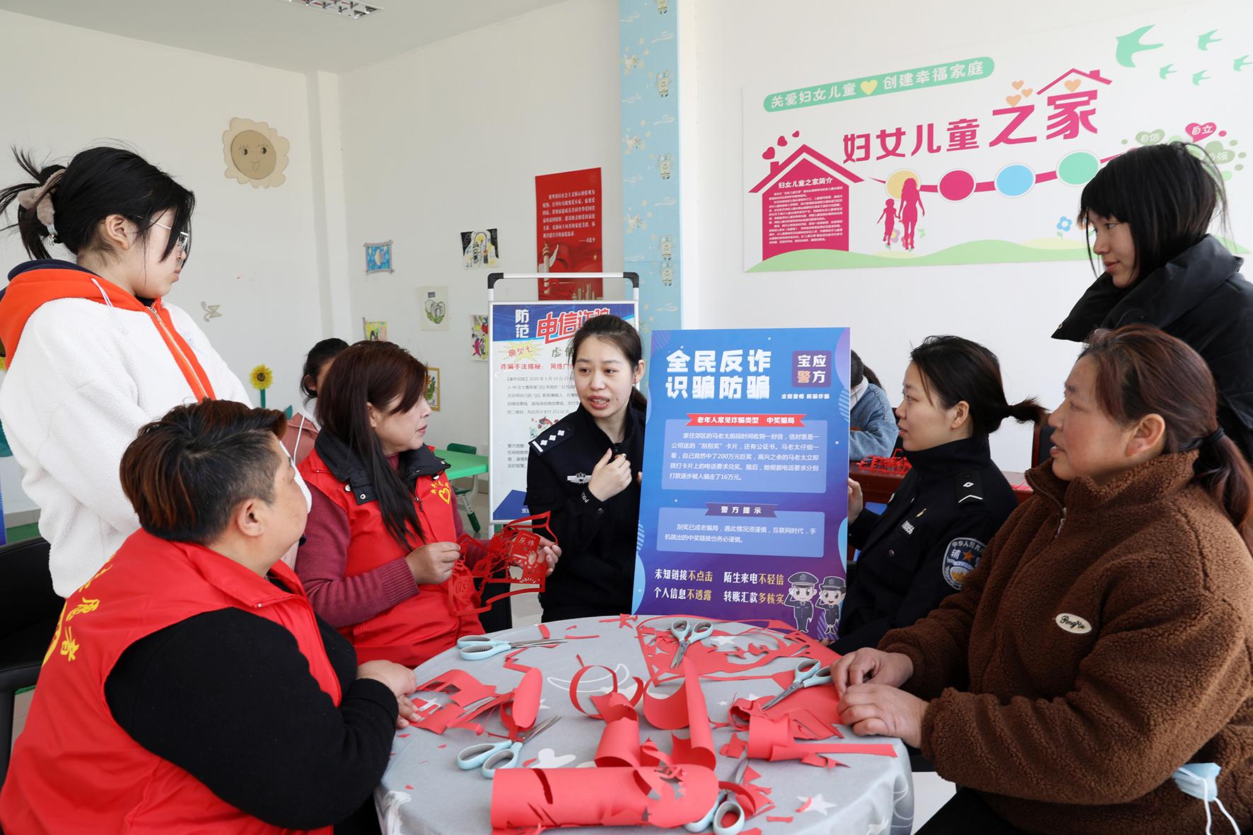 3月7日,江蘇省寶應(yīng)縣公安局女民警在新豐村婦女兒童之家宣傳反家庭暴力法及反詐知識(shí)。