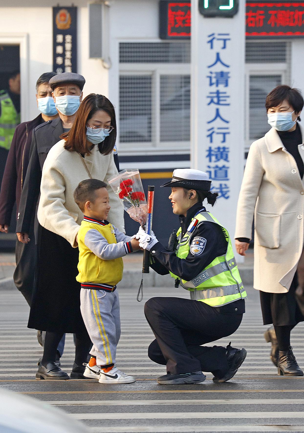 3月7日,陜西省渭南市區(qū)樂天大街與倉程路十字執(zhí)勤點(diǎn),女民警雷雨晴正在執(zhí)勤,忽然一位小朋友拿著一束鮮花跑到她面前說:“阿姨,您辛苦了,節(jié)日快樂!”