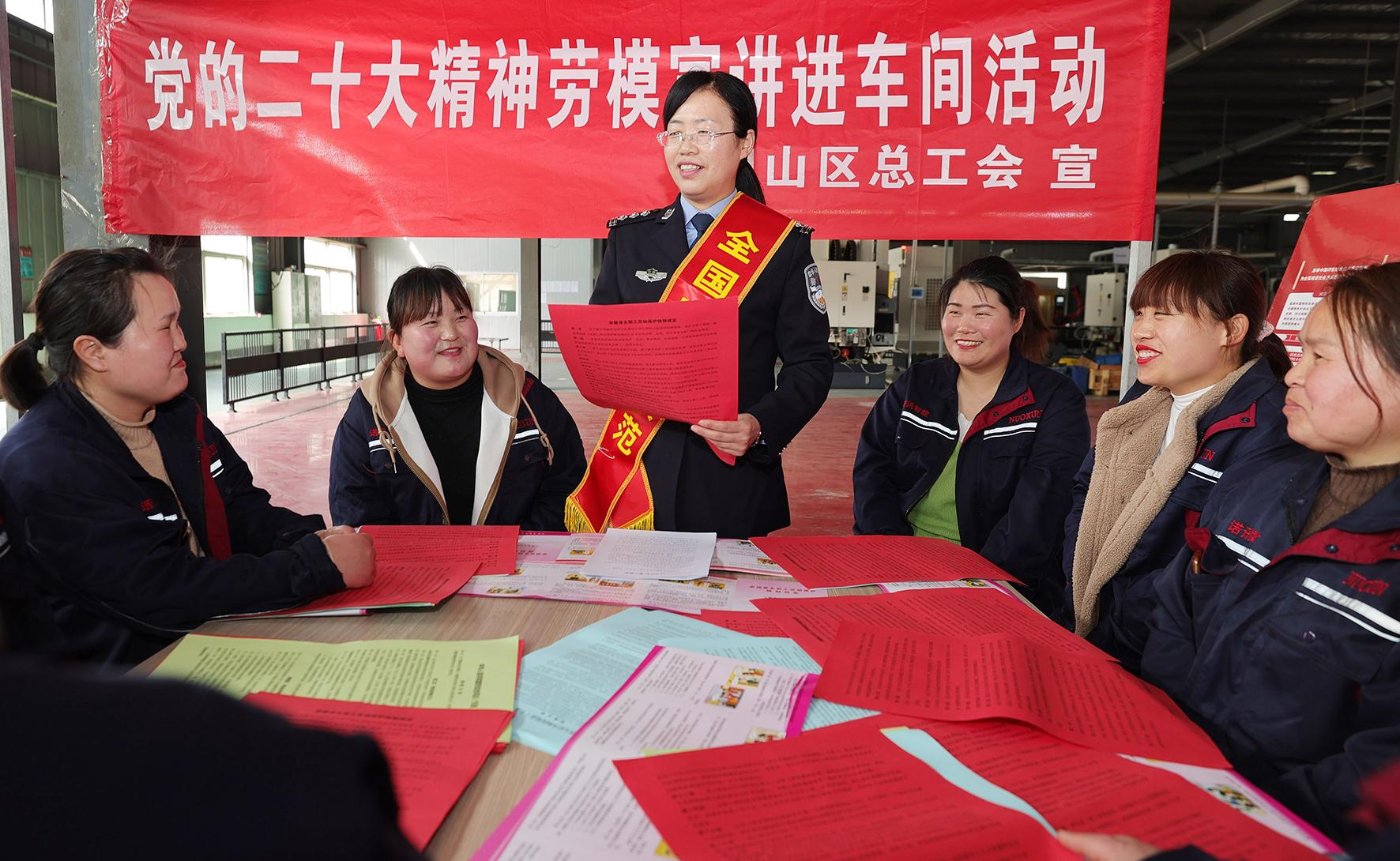 3月7日,安徽省淮北市相山經(jīng)濟(jì)開發(fā)區(qū)企業(yè)生產(chǎn)車間,全國勞動(dòng)模范、淮北市公安局三堤口派出所所長王懷芬為一線女職工講述立足崗位作貢獻(xiàn)的奮斗故事。