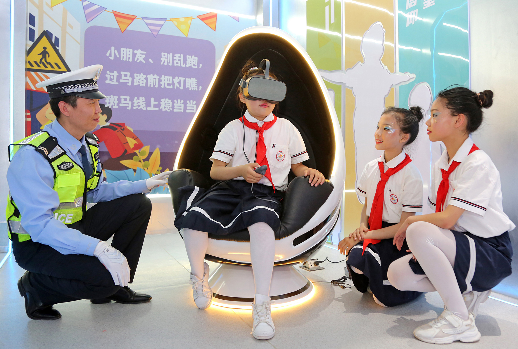 5月30日,陜西省渭南市高新區(qū)紅旗駕校交通安全教育基地兒童VR交通安全模擬體驗(yàn)區(qū),小學(xué)生在沉浸式體驗(yàn)道路交通安全。當(dāng)日,渭南市公安局交警支隊(duì)高新大隊(duì)開(kāi)展“知危險(xiǎn) 會(huì)避險(xiǎn)”交通安全主題宣傳活動(dòng)。