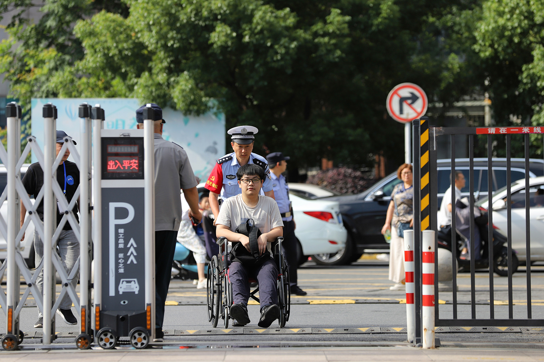 6月7日,山東省棗莊市公安局薛城分局民警在轄區(qū)棗莊第八中學(xué)考點幫助行動不便的考生進入考場。
