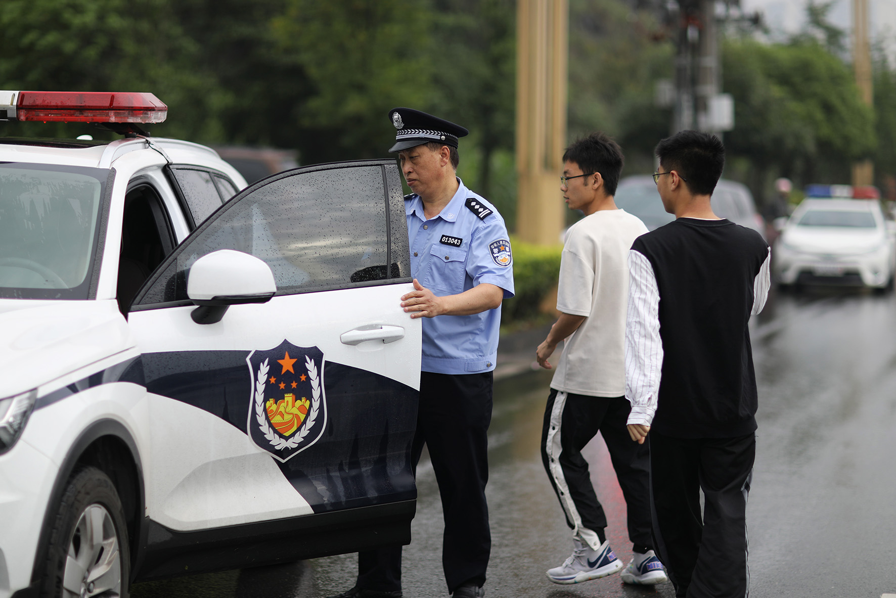 6月8日,貴州省赤水市公安局執(zhí)勤民警在第三中學(xué)考點準(zhǔn)備駕車幫助一位考生去取忘帶的準(zhǔn)考證。
