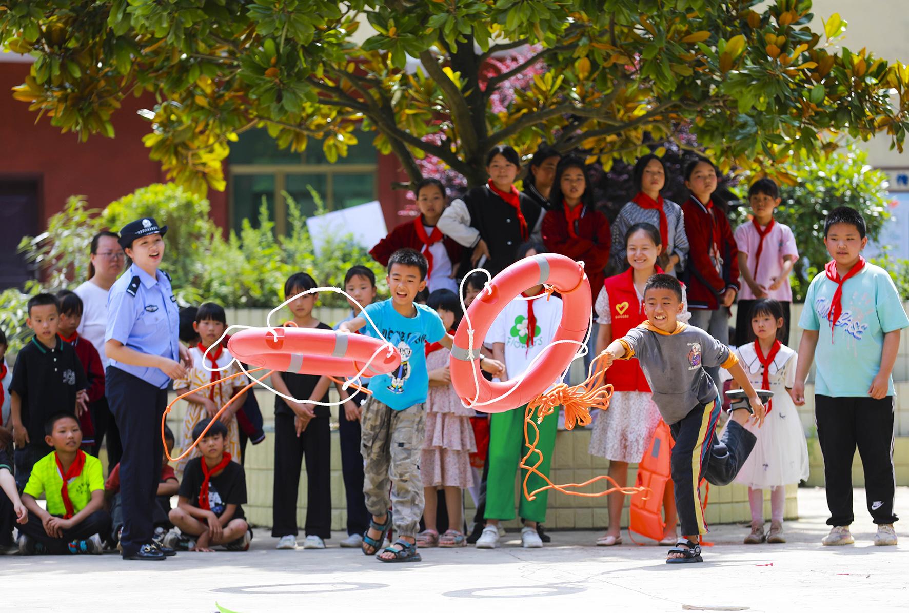 7月7日,在貴州省黔西市雨朵鎮(zhèn)沈場小學,民警指導學生學習使用救生圈。暑假臨近,黔西市公安局雨朵派出所民警到轄區(qū)各所學校開展防溺水安全教育主題活動。