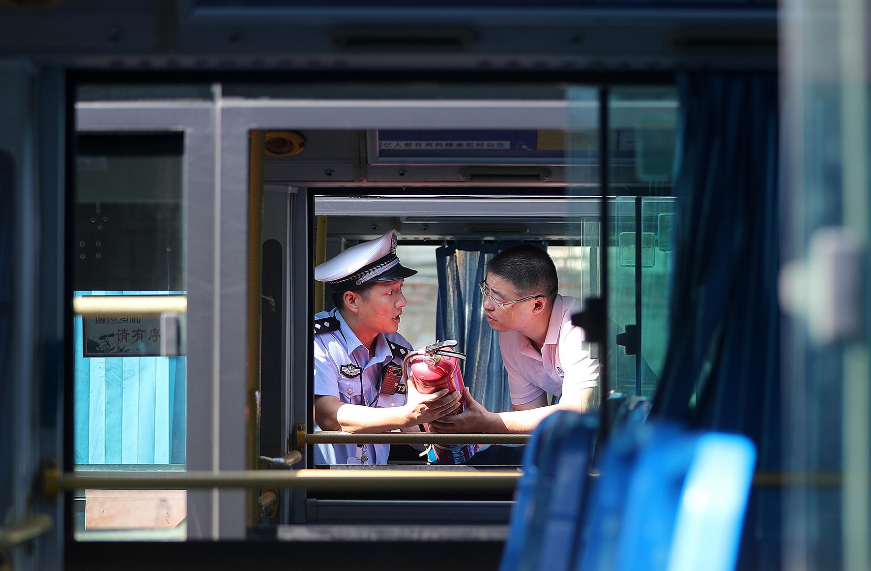 7月17日,湖北省荊門市公安局交警支隊(duì)民警仔細(xì)檢查公交車制動(dòng)系統(tǒng)、逃生錘、安全帶、滅火器等安全設(shè)備。連日來(lái),湖北天氣持續(xù)高溫,荊門市公安局交警支隊(duì)組織民警,對(duì)運(yùn)行的公交車開(kāi)展全面“體檢”,杜絕車輛“帶病”上路,確保群眾安全出行。