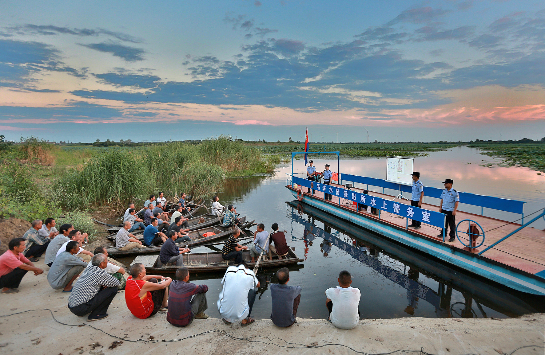 圖為9月14日傍晚,毛李水陸派出所民警在借糧湖畔,通過(guò)“流動(dòng)防?!逼桨舱n堂為村民放送反詐電影。