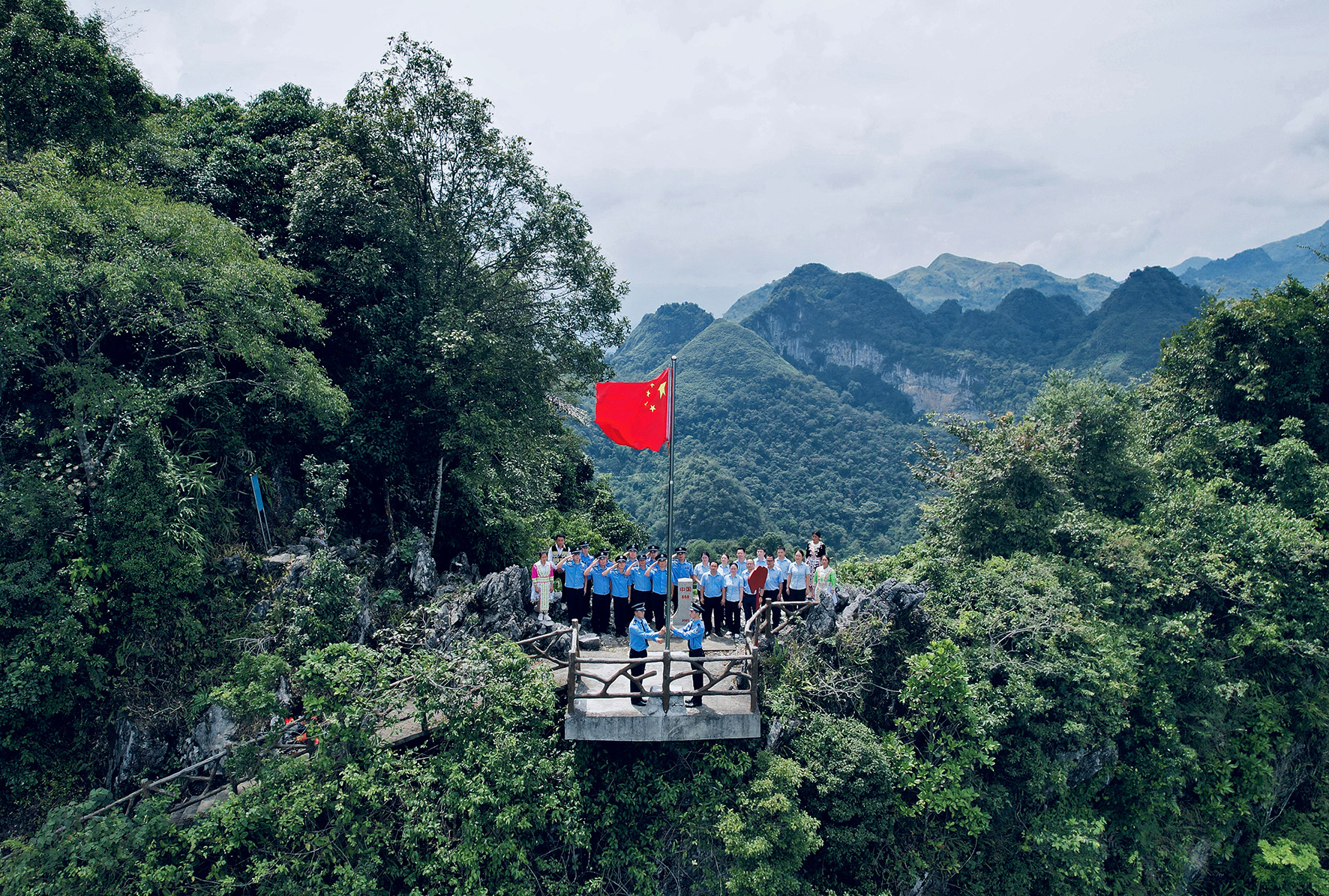 10月1日,廣西邊檢總站百色邊境管理支隊百南邊境派出所聯(lián)合駐地干部職工、少數(shù)民族群眾在祖國西南邊陲的中越588號界碑旁升起五星紅旗。
