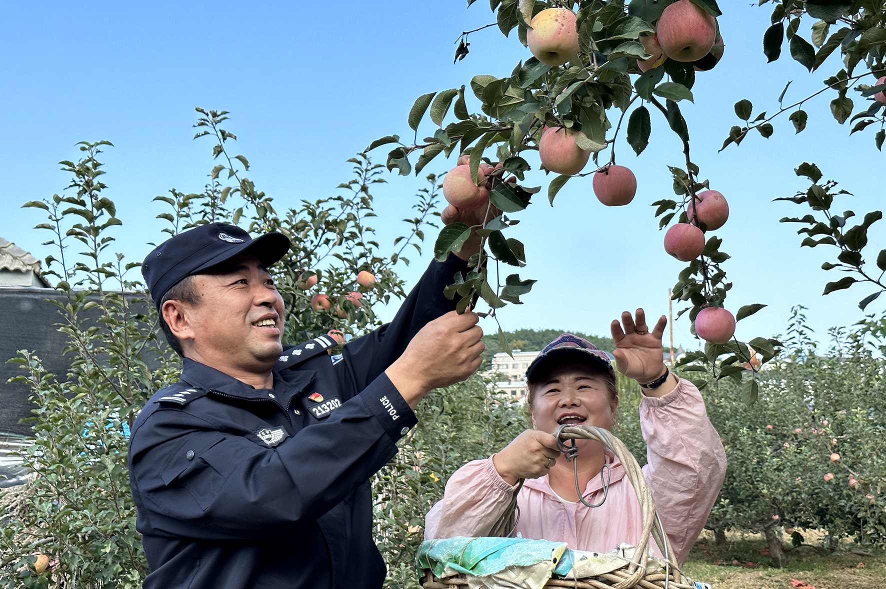 圖為10月11日,民警幫助村民采摘蘋(píng)果。