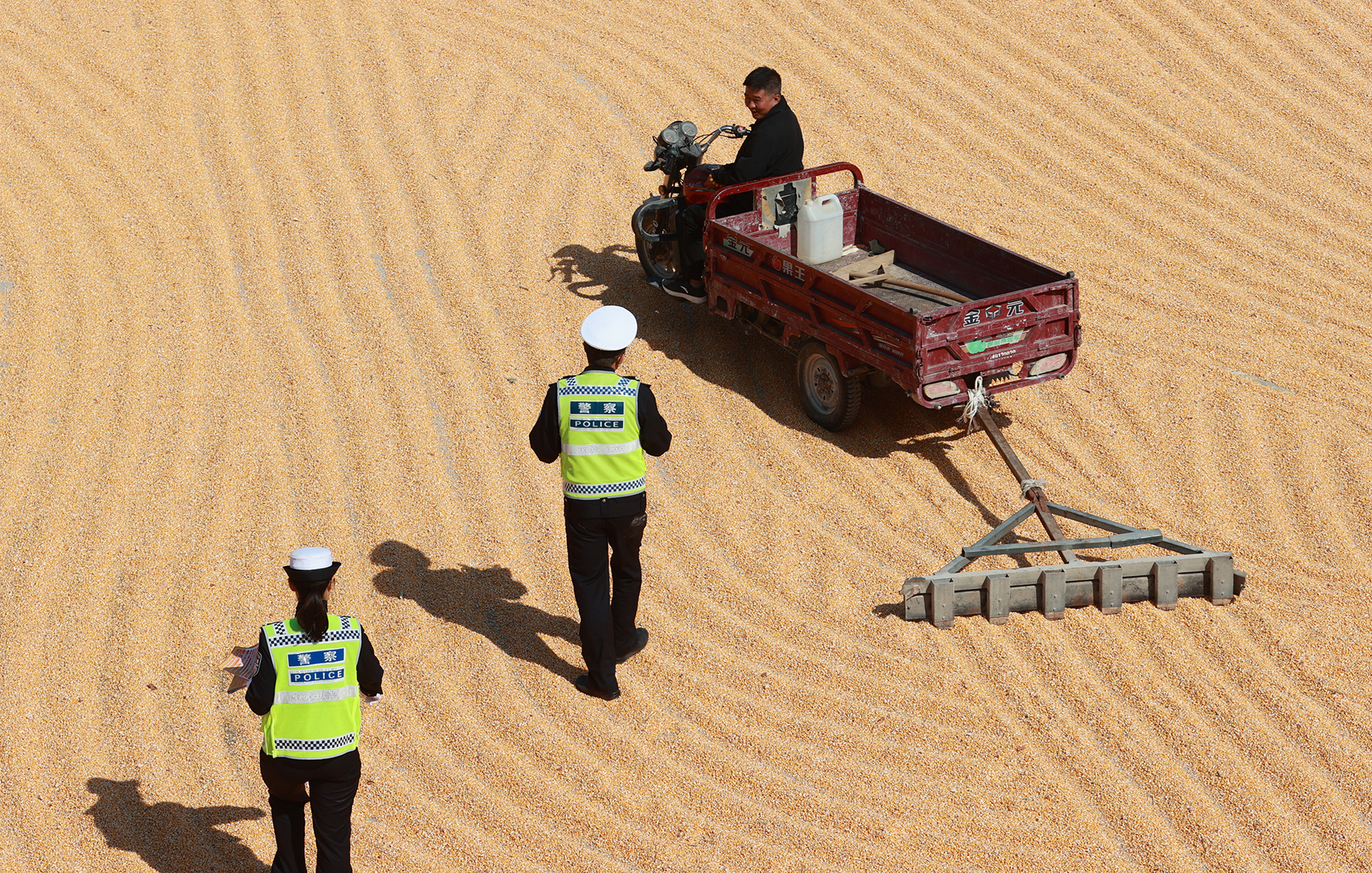10月16日,陜西省大荔縣公安局交管大隊(duì)民警走進(jìn)韋林鎮(zhèn)30多家機(jī)關(guān)、村部等為方便群眾“開(kāi)院曬糧”的場(chǎng)地,重點(diǎn)對(duì)晾曬翻攪糧食的摩托車駕駛?cè)藛T進(jìn)行勿忘戴頭盔和禁止酒后駕駛的宣傳,杜絕一切安全隱患。