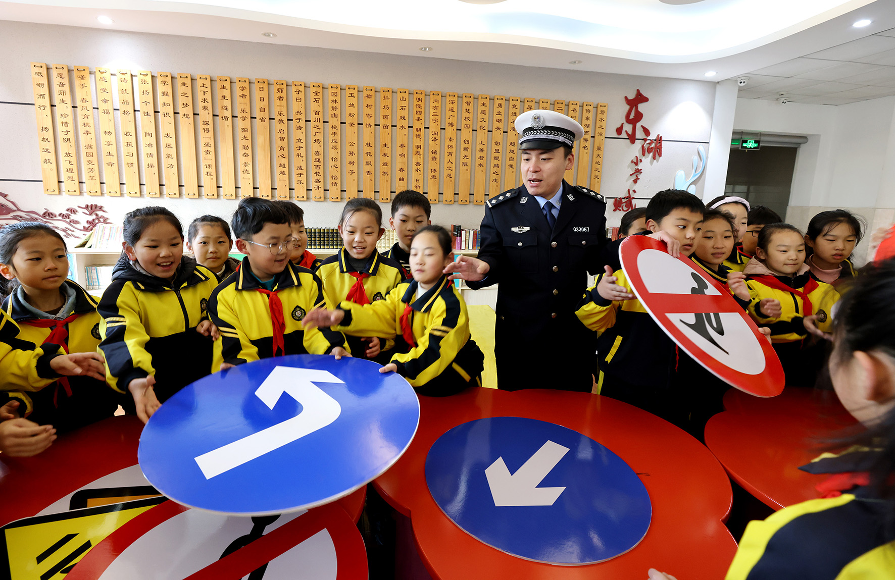 11月30日,山東省棗莊市公安局市中分局交通警察大隊民警與東湖小學(xué)學(xué)生一起做交通安全趣味游戲。
