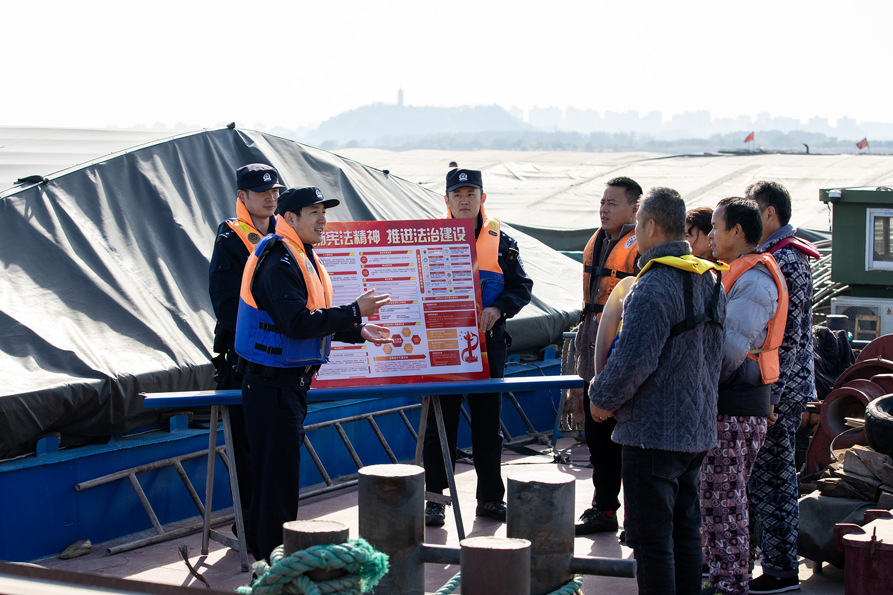 12月1日,長(zhǎng)江航運(yùn)公安局鎮(zhèn)江分局結(jié)合“百萬(wàn)警進(jìn)千萬(wàn)家”活動(dòng),組織民警前往轄區(qū)長(zhǎng)江錨地水域開展“船頭普法課堂”,普及憲法知識(shí)。