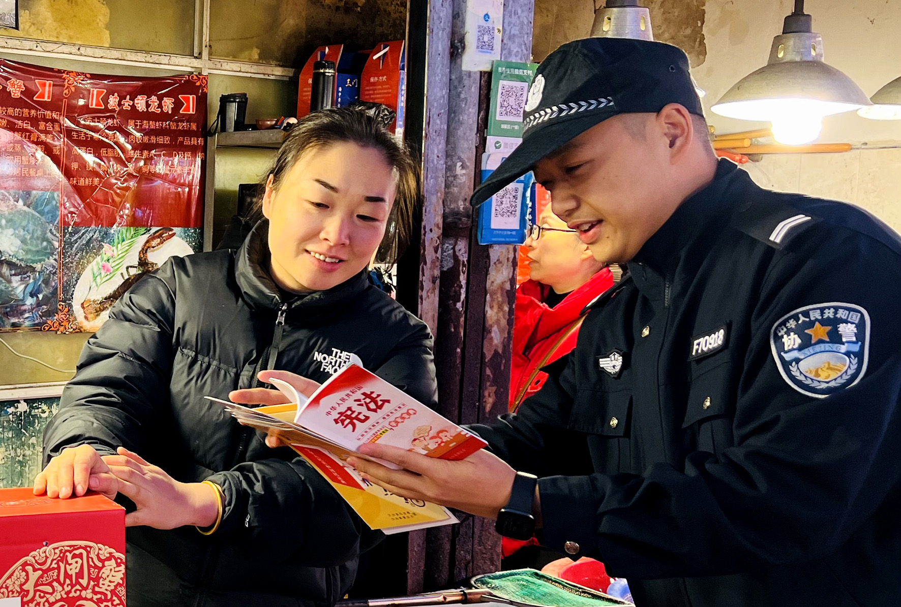 12月4日,浙江省臺(tái)州市天臺(tái)縣公安局民輔警走進(jìn)農(nóng)貿(mào)市場(chǎng)開展憲法宣傳活動(dòng)。