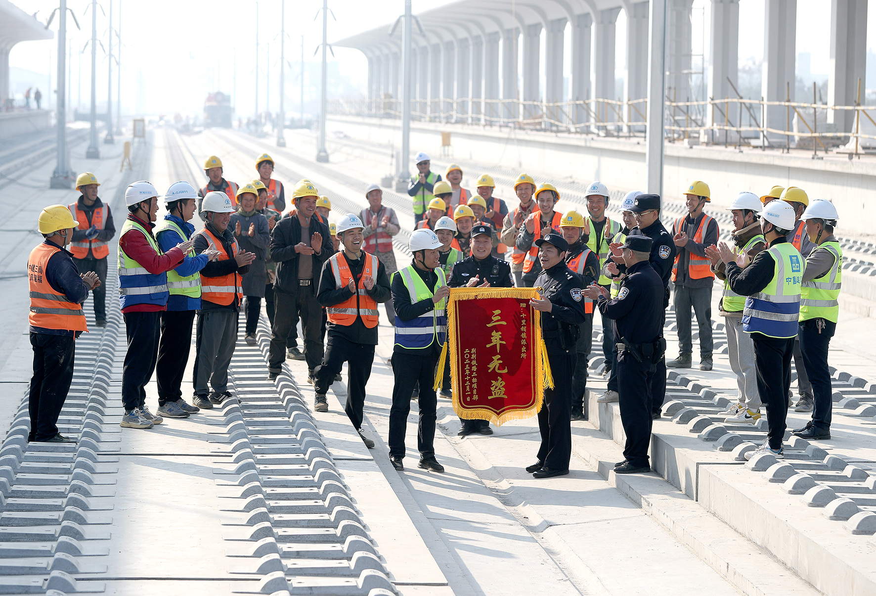 12月5日,在湖北荊荊高鐵沙洋縣十里鋪段建設(shè)工地,項目負責人率員工向湖北省沙洋縣公安局十里鋪派出所民警送上一面印有“三年無盜”的錦旗。