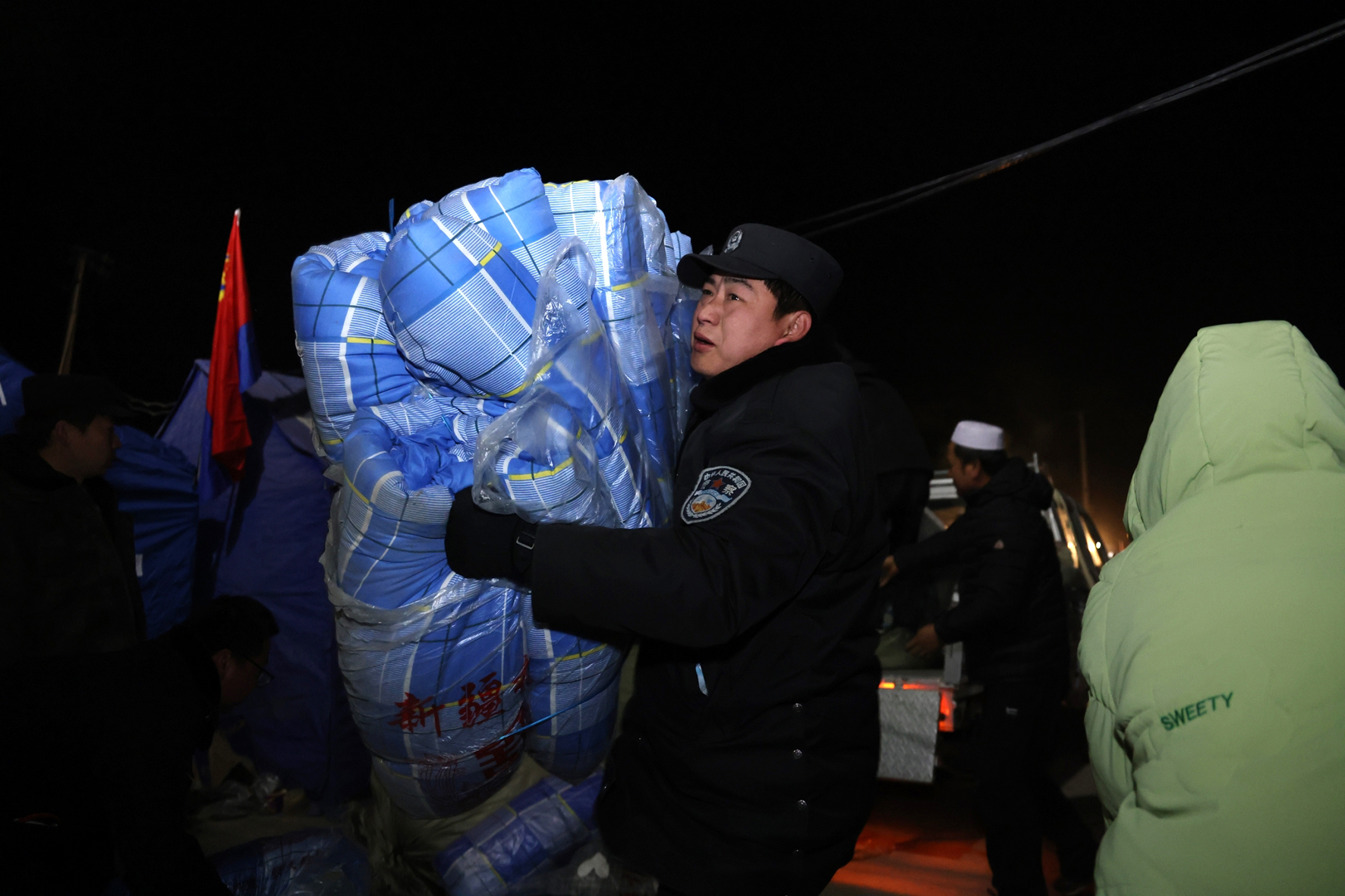 圖三:12月20日22時(shí)許,民輔警搬運(yùn)救災(zāi)物資。