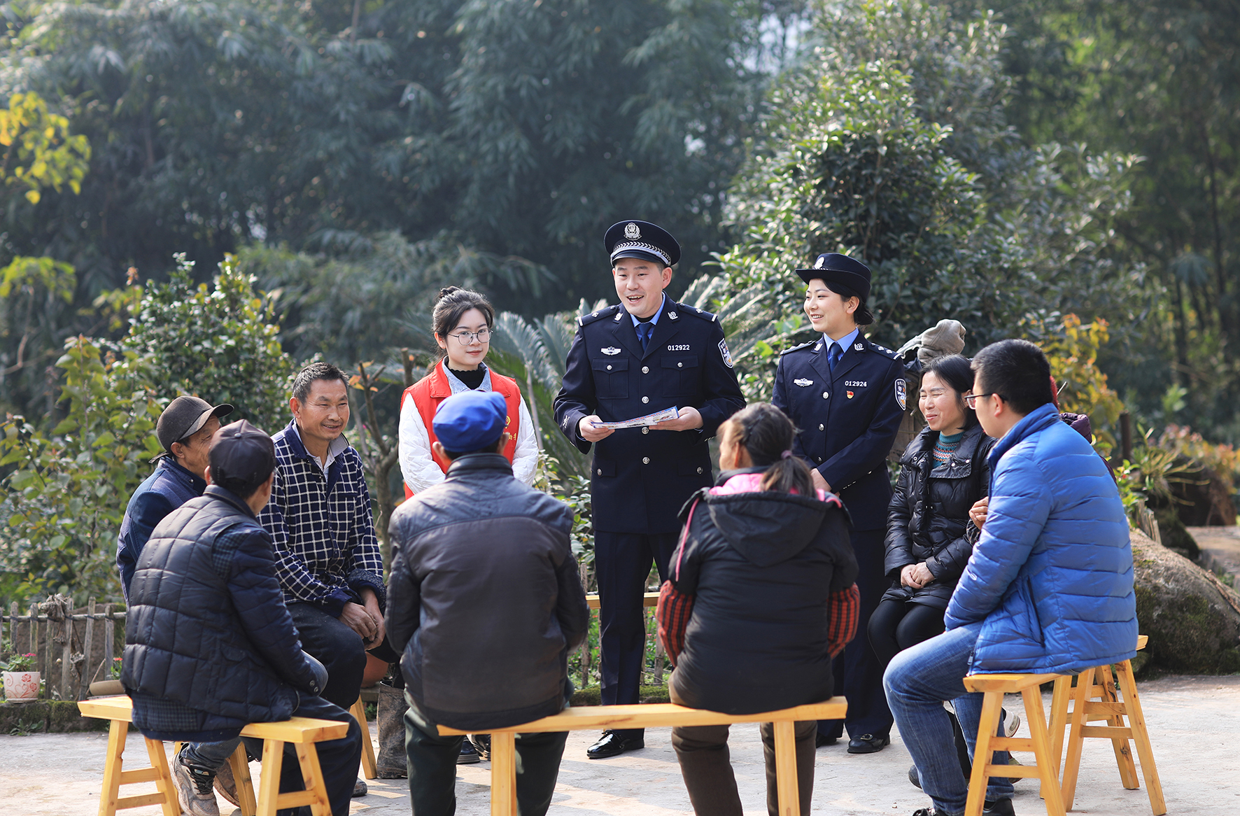 圖為12月27日,在赤水市官渡鎮(zhèn)玉皇村,民警和黨員志愿者在“院壩會(huì)”上向群眾普及禁毒禁賭、防火防盜等知識(shí)。