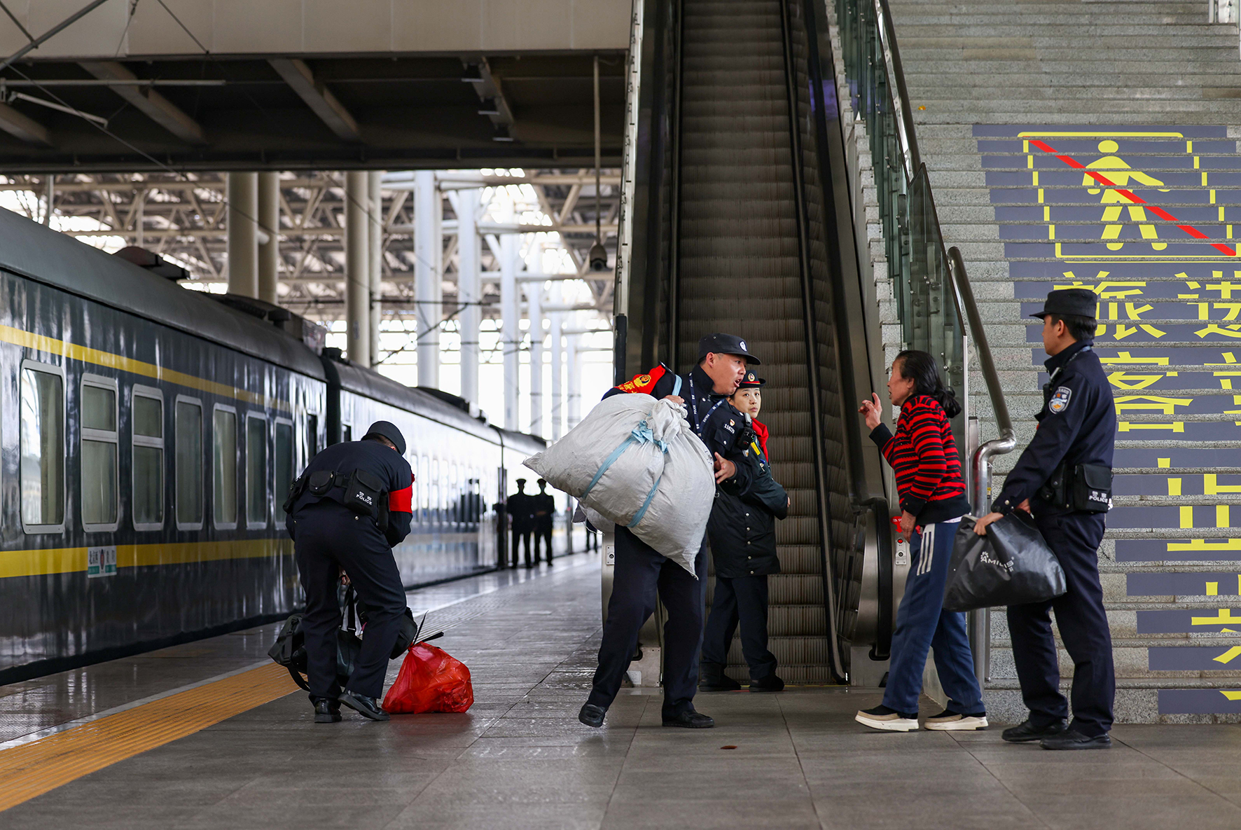 2023年12月31日,成都鐵路公安局貴陽(yáng)公安處乘警支隊(duì)民警幫助旅客搬運(yùn)行李。