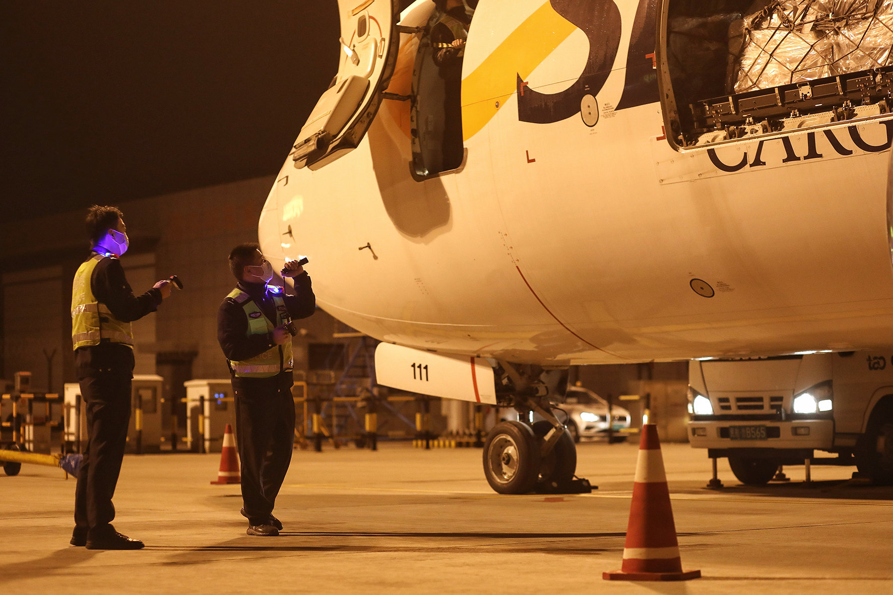 1月1日,山東出入境邊防檢查總站青島機(jī)場(chǎng)邊檢站民警對(duì)新年的首架國(guó)際貨運(yùn)航班進(jìn)行清艙檢查。