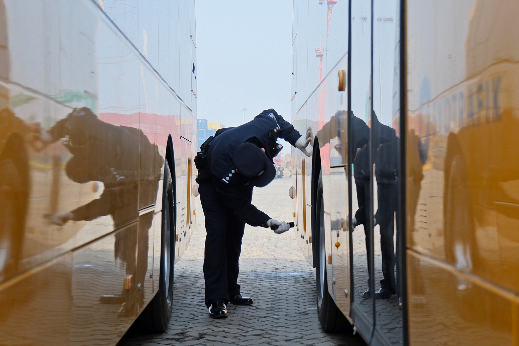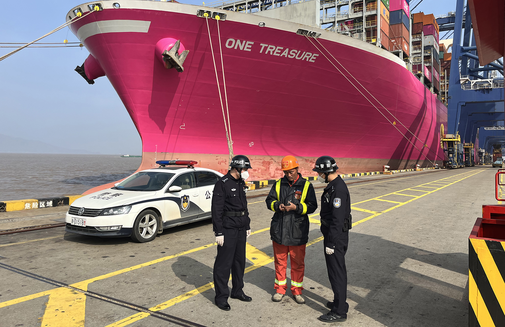 1月1日,寧波出入境邊防檢查站綜合執(zhí)勤七隊(duì)民警在大榭港區(qū)集裝箱碼頭開展巡邏檢查。