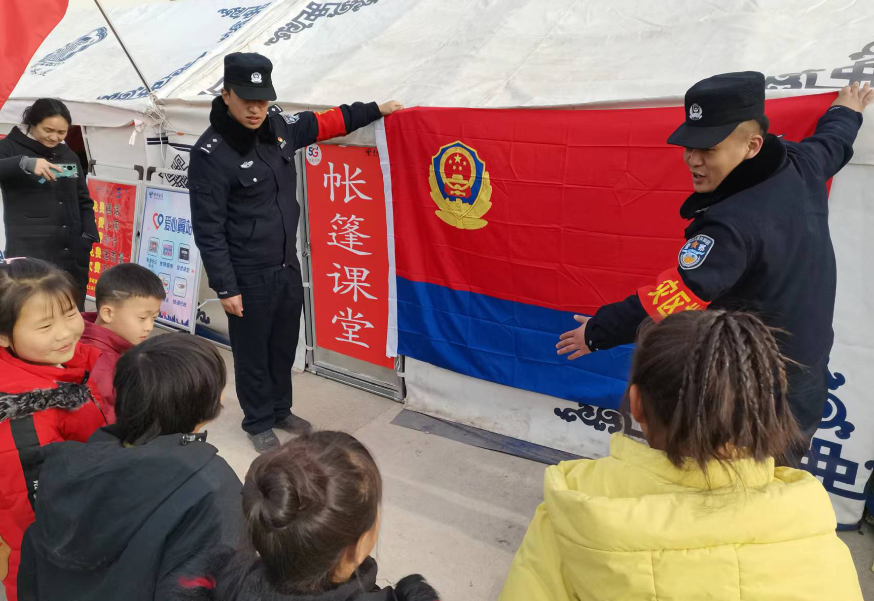1月10日上午,在甘肅省積石山縣大河家鎮(zhèn)大河村“抗震前線110”警務室,永靖縣公安局支援民警給小學生們上一堂警察節(jié)知識課。