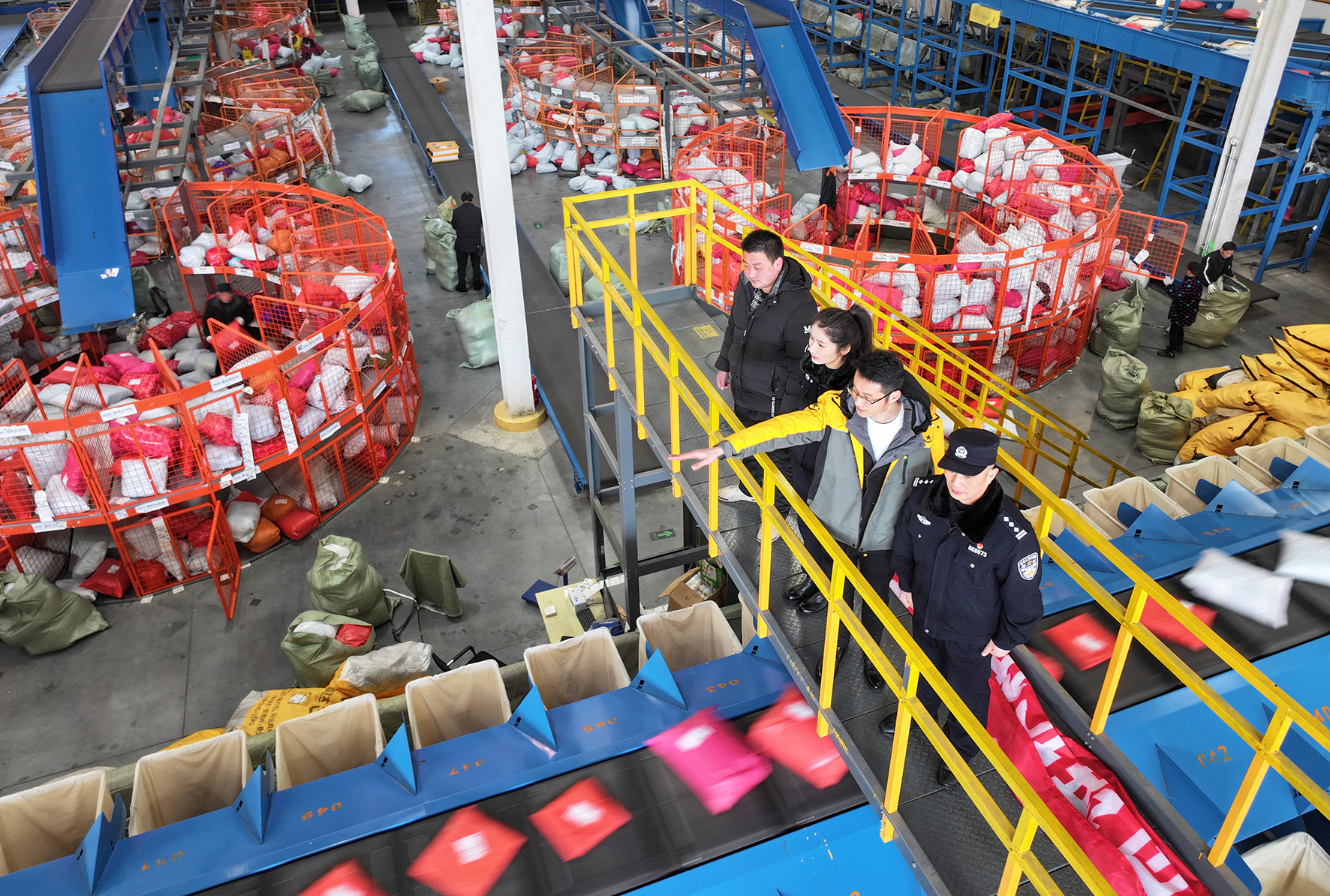 1月23日,在江蘇省南通市海門區(qū)三星鎮(zhèn)深國(guó)際·疊石橋現(xiàn)代國(guó)際物流園區(qū),海門區(qū)公安局“企無憂”服務(wù)隊(duì)民警走進(jìn)分揀中心,了解安全生產(chǎn)情況,宣傳寄遞業(yè)相關(guān)法律。
