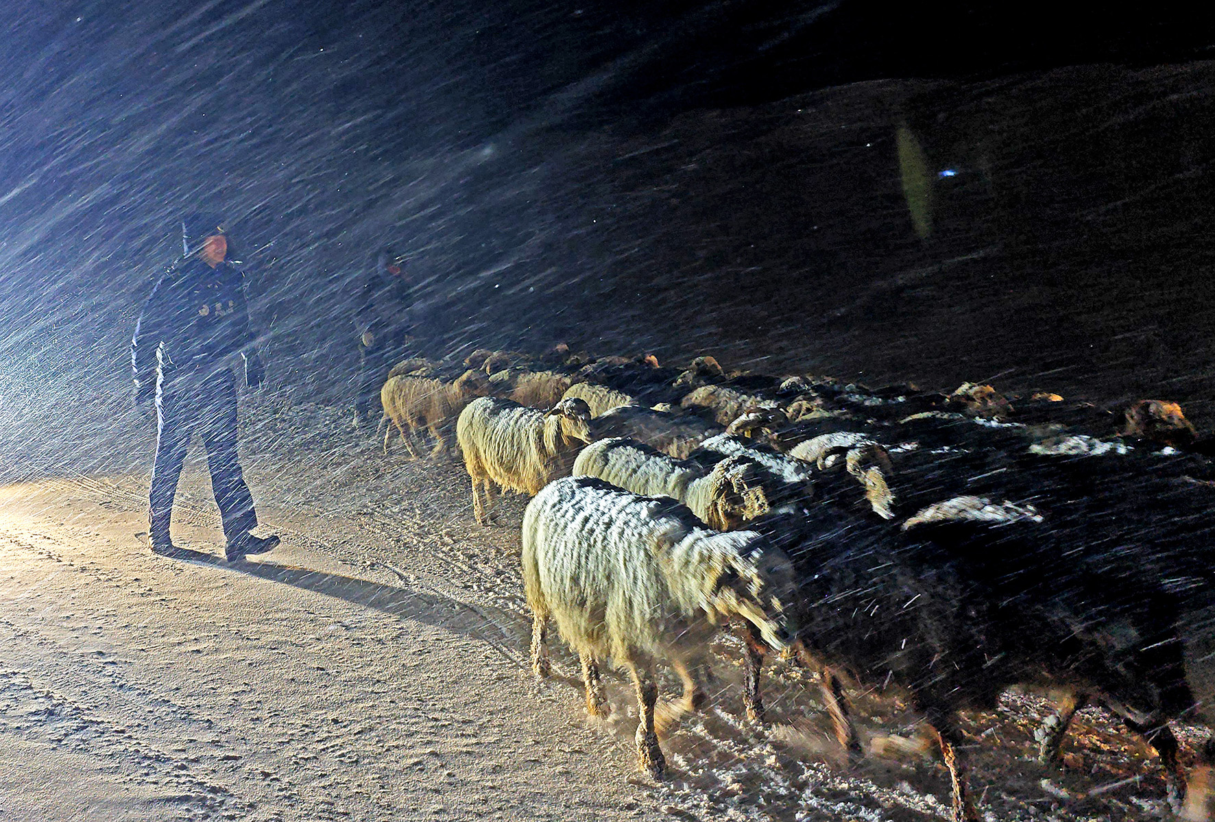 2月16日晚,新疆伊犁夏特邊境派出所接到牧民轉場途中遭遇暴風雪被困的報警求助,民警們經過三個小時的長途跋涉,成功將牧民和1000余只牲畜平安護送至定居點。