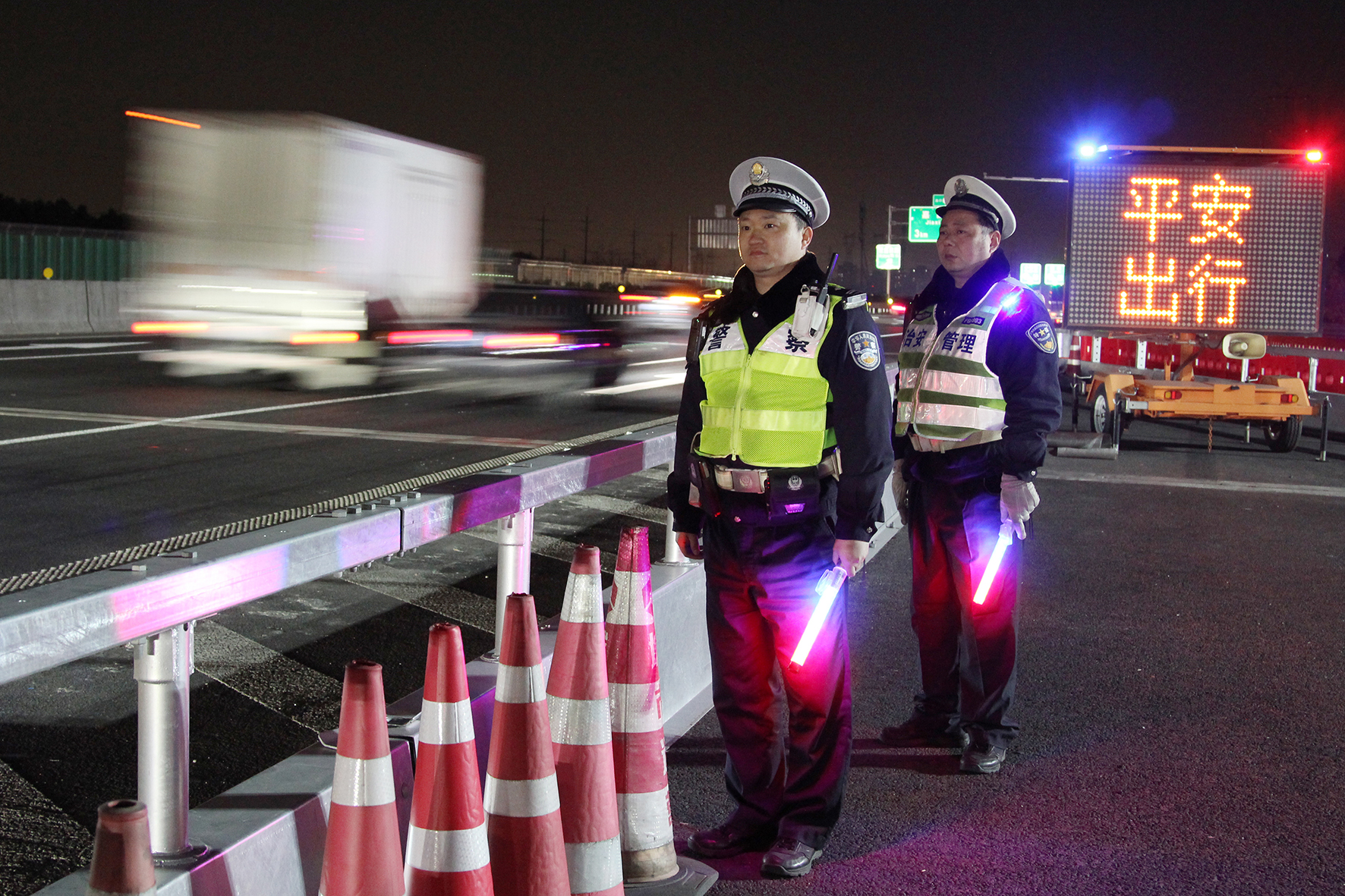 2月16日晚,上海市公安局嘉定分局交警支隊朱橋檢查站民輔警在G15沈海高速朱橋段駐守觀測、疏導返程入滬車流。