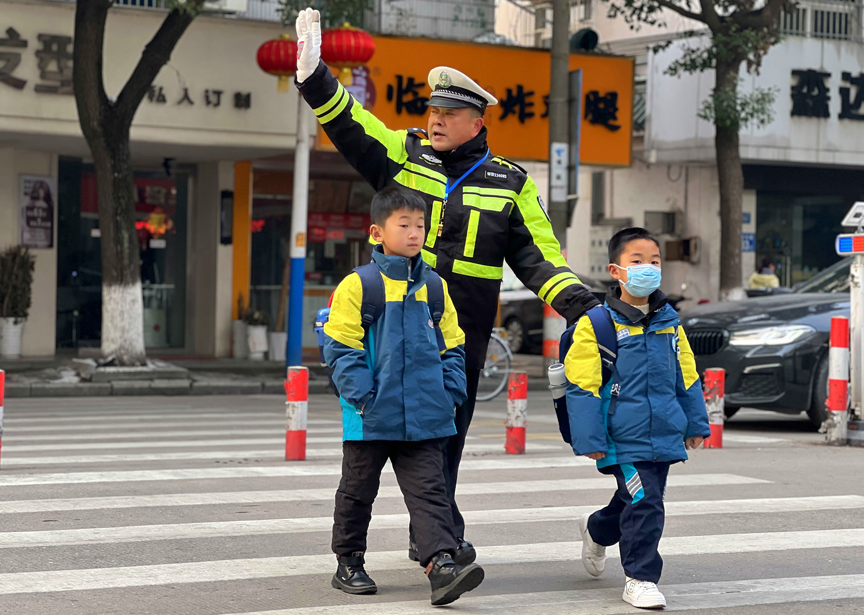 2月26日,安徽省當(dāng)涂縣公安局交管大隊(duì)民警在團(tuán)結(jié)街小學(xué)護(hù)送學(xué)生過(guò)斑馬線。