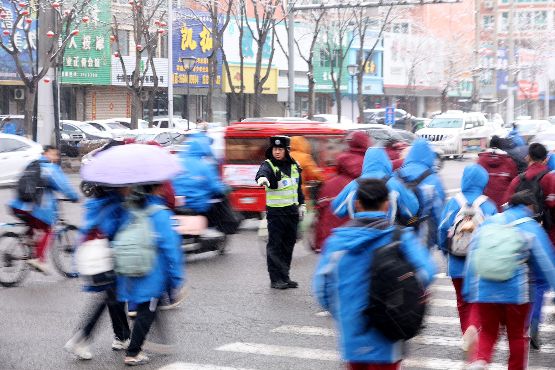 3月19日,遼寧省阜新市突降小雪。阜新市公安局交通警察支隊細(xì)河大隊民輔警頂風(fēng)冒雪,站好“護(hù)學(xué)崗”。