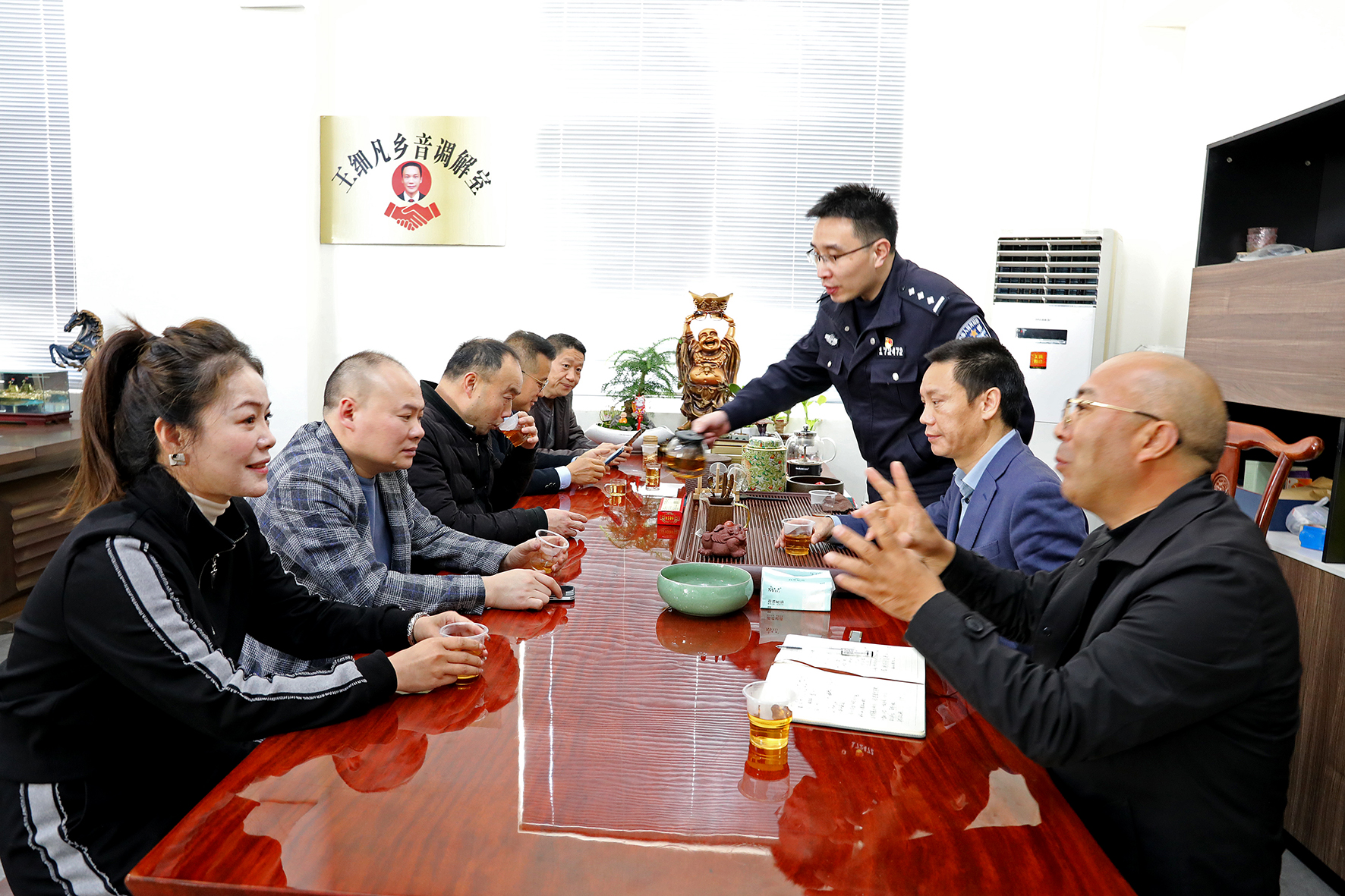 圖為3月19日,以王細(xì)凡個(gè)人命名的湖北籍鄉(xiāng)音調(diào)解室邀請杜橋派出所社區(qū)警務(wù)隊(duì)民警和專職調(diào)解員為“鄉(xiāng)音鄉(xiāng)情”調(diào)解員講解工作技巧。