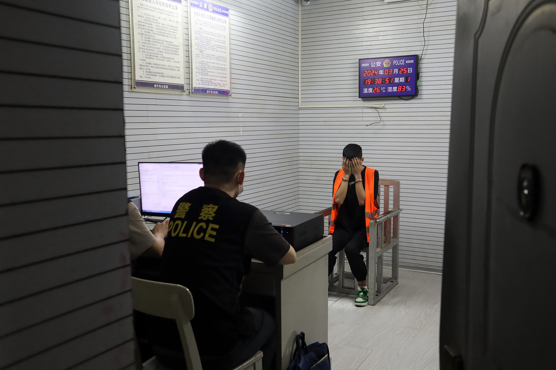 3月25日,在廣西南寧市公安局江南派出所,山東省濟南市公安局市中區(qū)分局民警對電詐嫌疑人張某進行審訊。