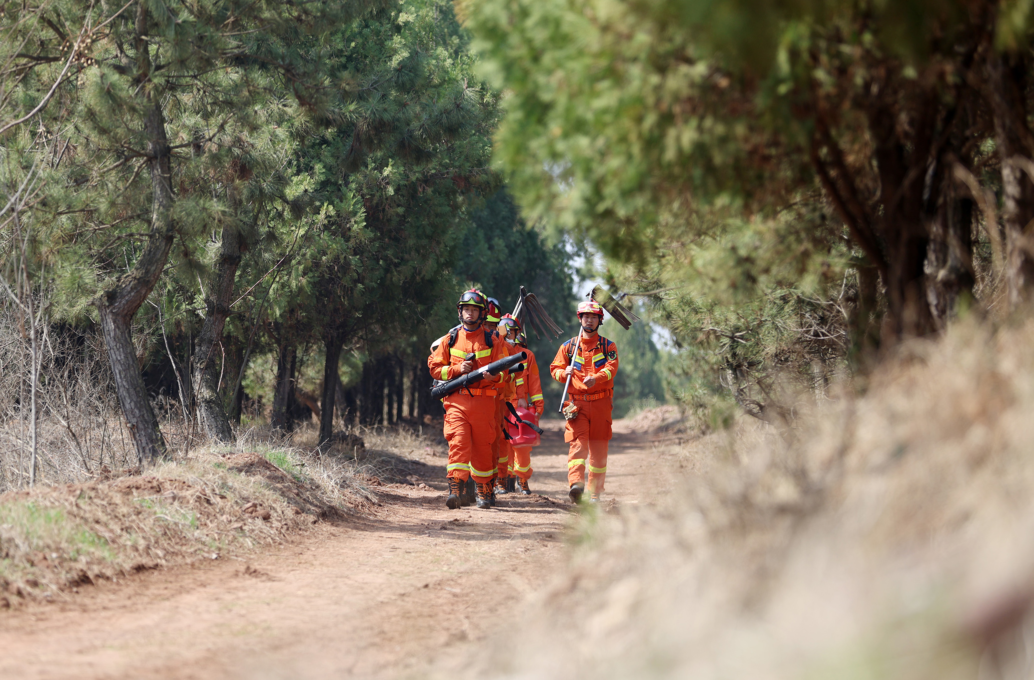 圖為4月1日,消防救援人員在郯城街道團(tuán)山村林區(qū)巡邏。