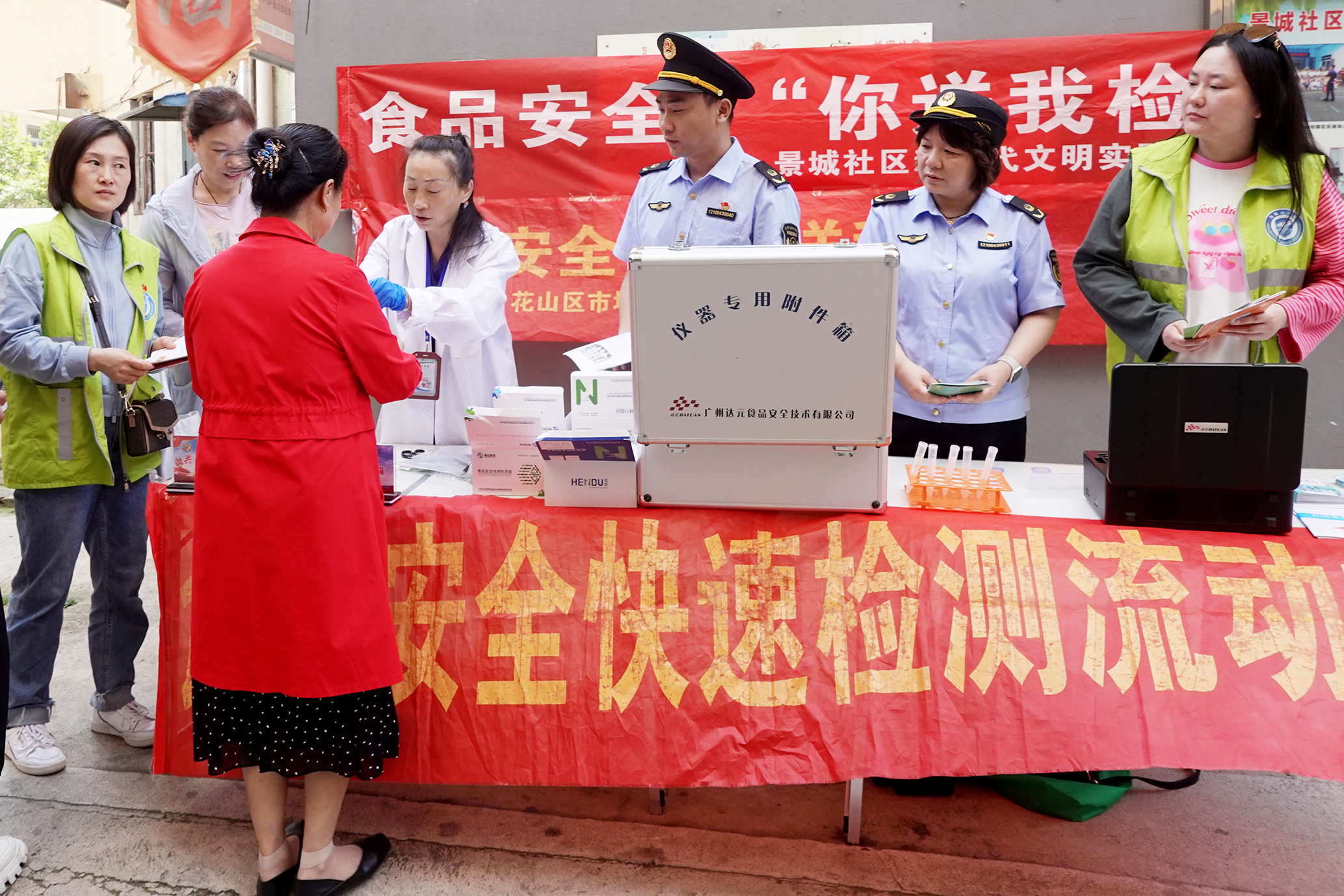 5月13日,安徽省馬鞍山市花山區(qū)桃源路街道景城社區(qū)聯(lián)合花山區(qū)市場監(jiān)督管理局桃源所,在師苑市場開展食品安全“你送我檢”活動,免費為群眾提供食品安全快速檢測服務。