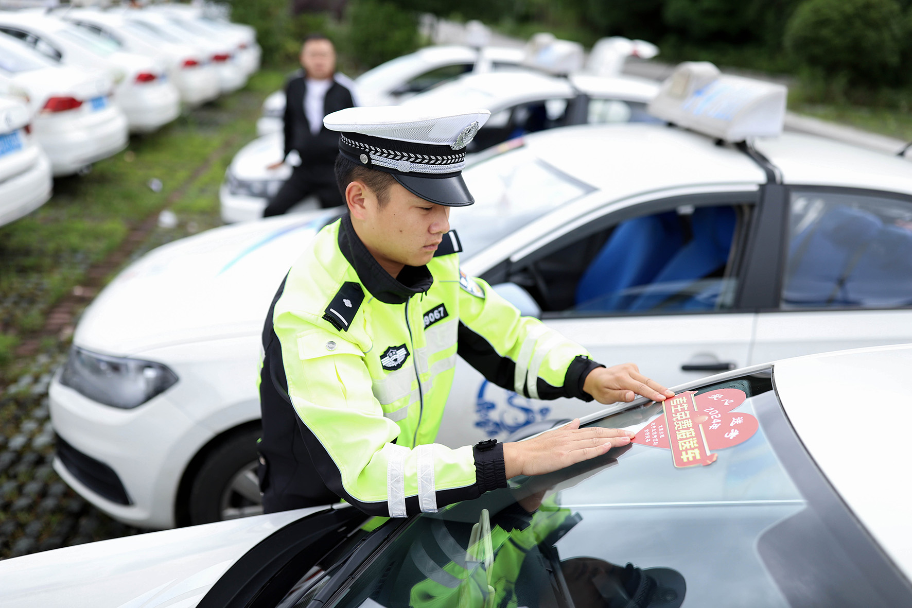 6月5日,貴州省黔東南苗族侗族自治州丹寨縣公安局交警大隊民警為“愛心護考車隊”粘貼考生接送車車貼。