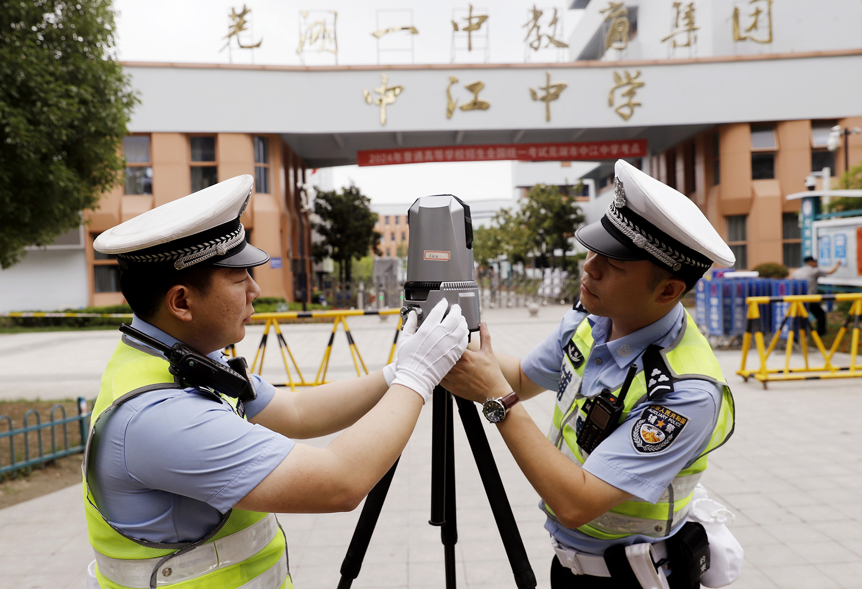 6月6日,安徽省蕪湖市公安局交警支隊鳩江大隊民警在中江中學(xué)考點門前路段擺放調(diào)試布控球臨時監(jiān)控設(shè)備。