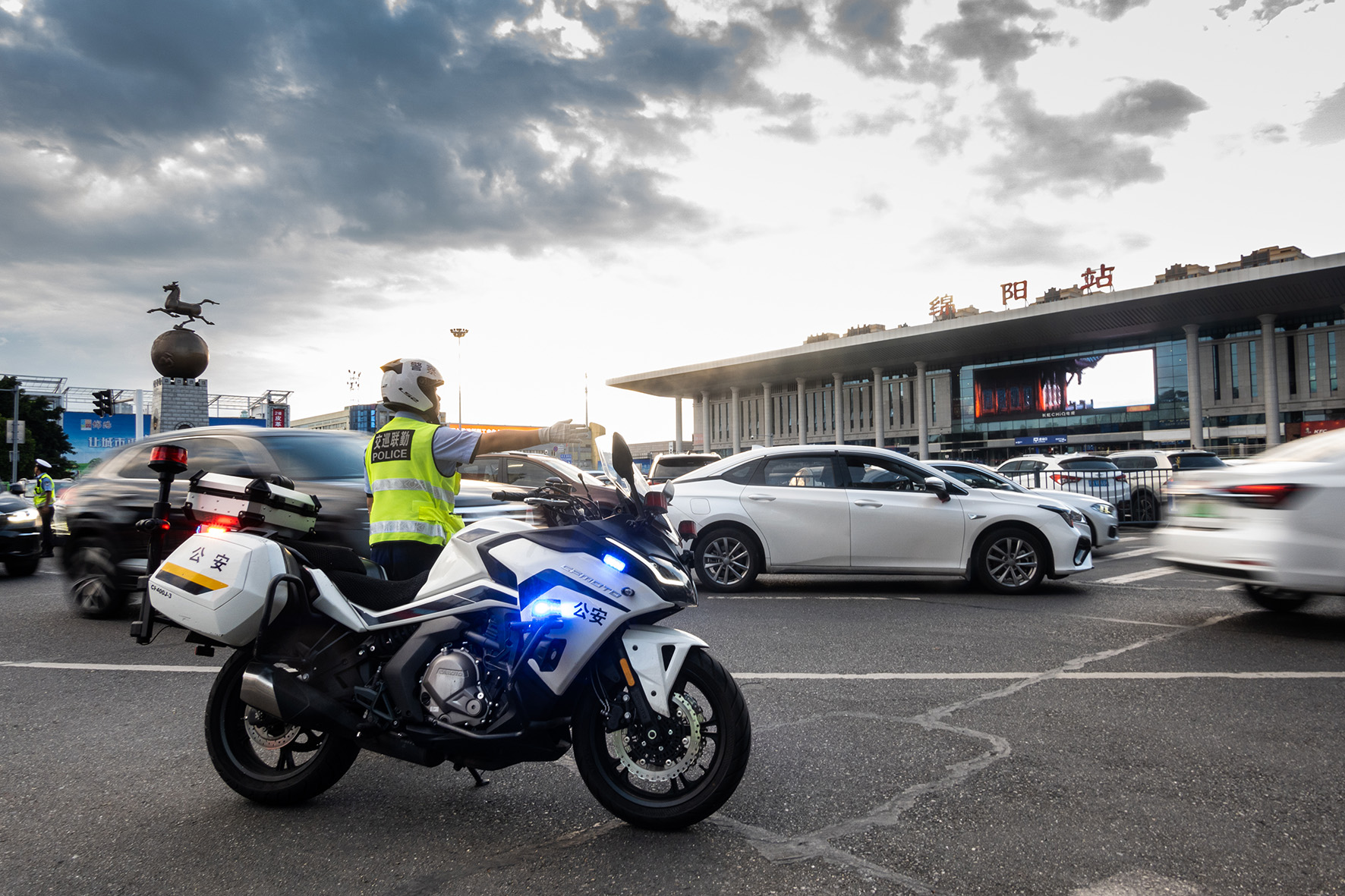 6月8日,四川省綿陽市公安局特巡警支隊(duì)巡邏五大隊(duì)、交警支隊(duì)直屬一大隊(duì)在綿陽市火車站等人流密集區(qū)域聯(lián)勤開展勤務(wù),為群眾出行保駕護(hù)航。