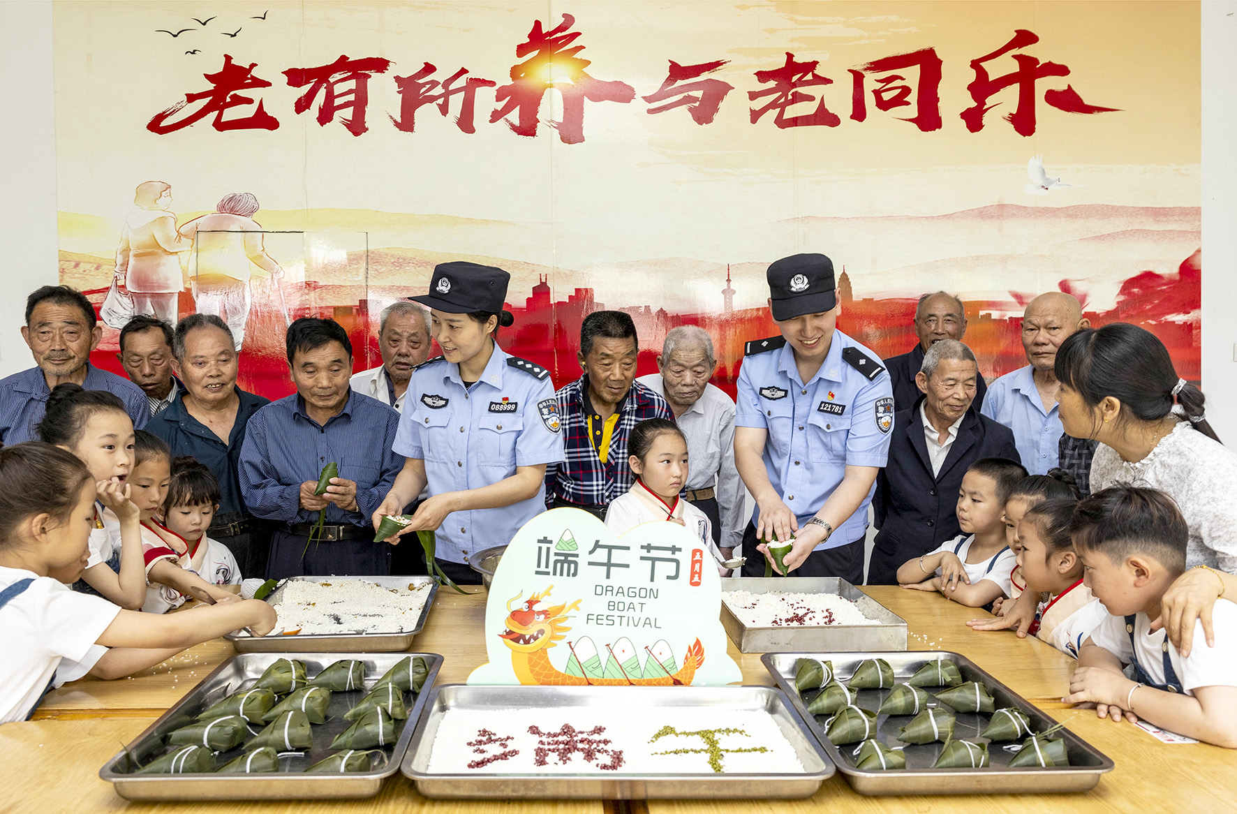 6月9日,安徽省舒城縣公安局交管大隊(duì)聯(lián)合五顯派出所走進(jìn)轄區(qū)敬老院,與老人們一起包粽子,宣講出行、用電等方面安全知識(shí)。