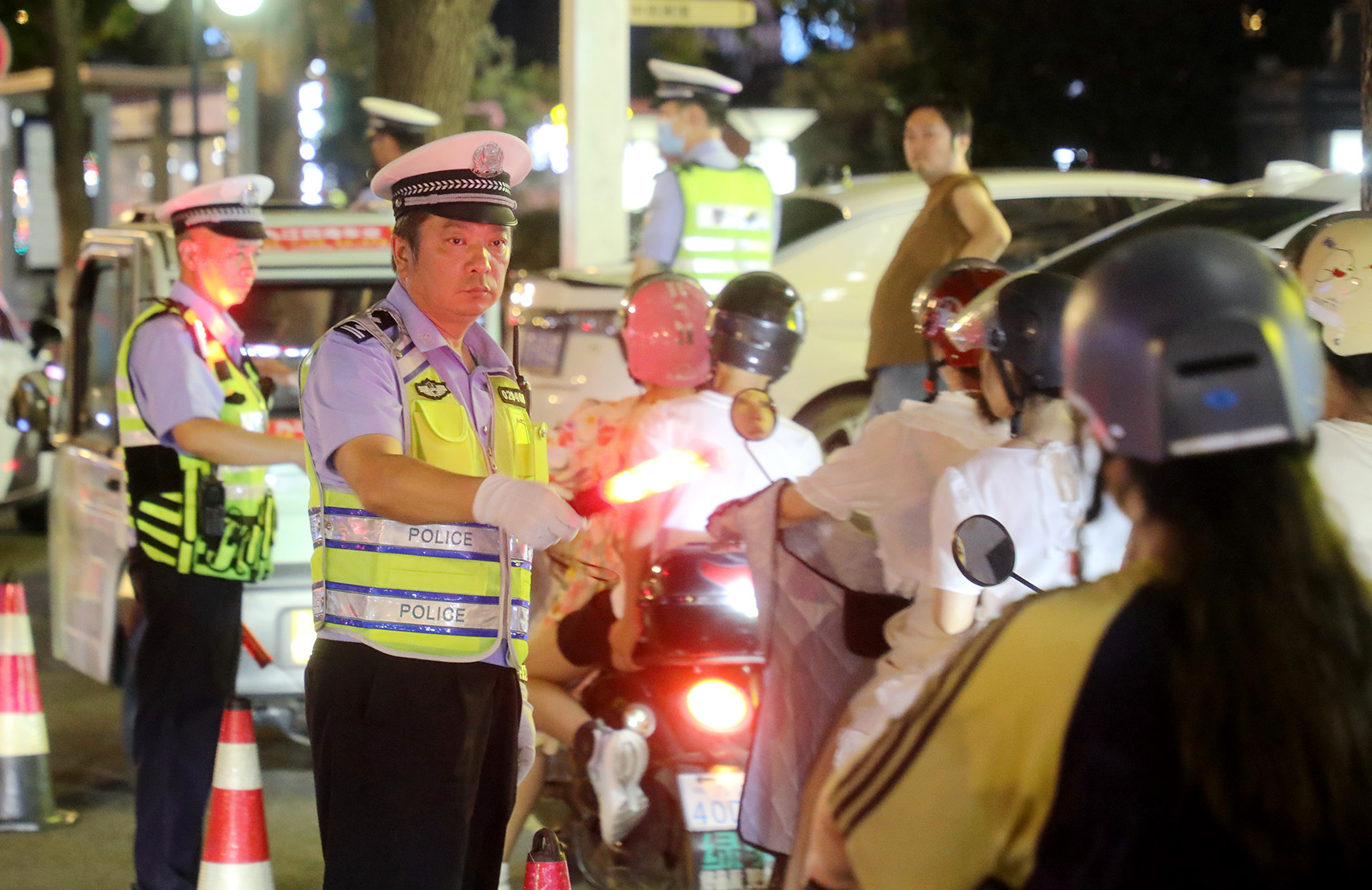 7月6日晚,安徽省合肥市公安局交警支隊(duì)瑤海大隊(duì)民警在街面嚴(yán)查交通違法行為。