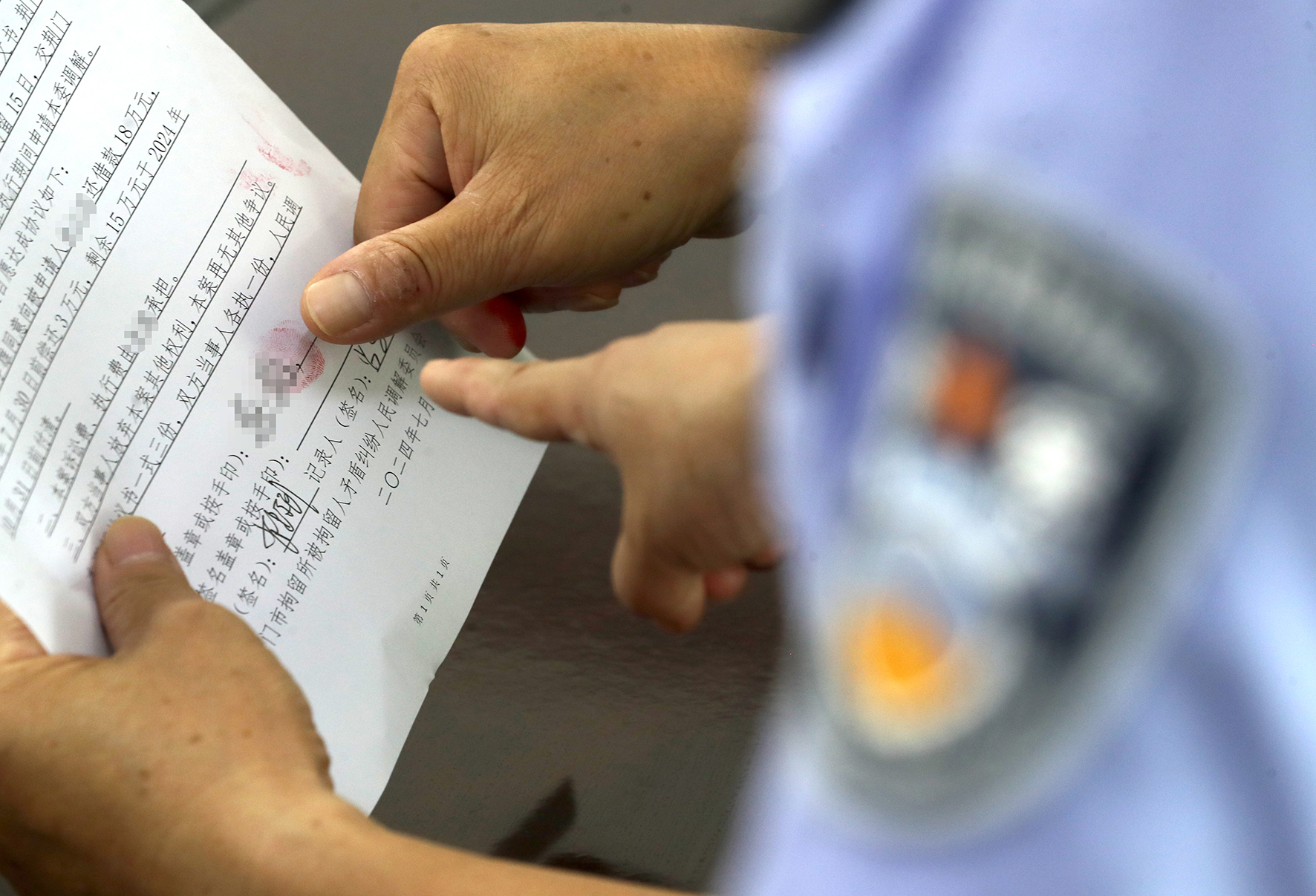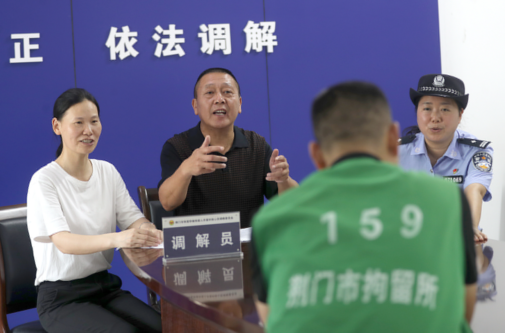 圖二:7月8日,在荊門市拘留所,人民調(diào)解員、執(zhí)行法官和律師通過“聯(lián)動(dòng)調(diào)解”,督促“老賴”履行相關(guān)義務(wù)。