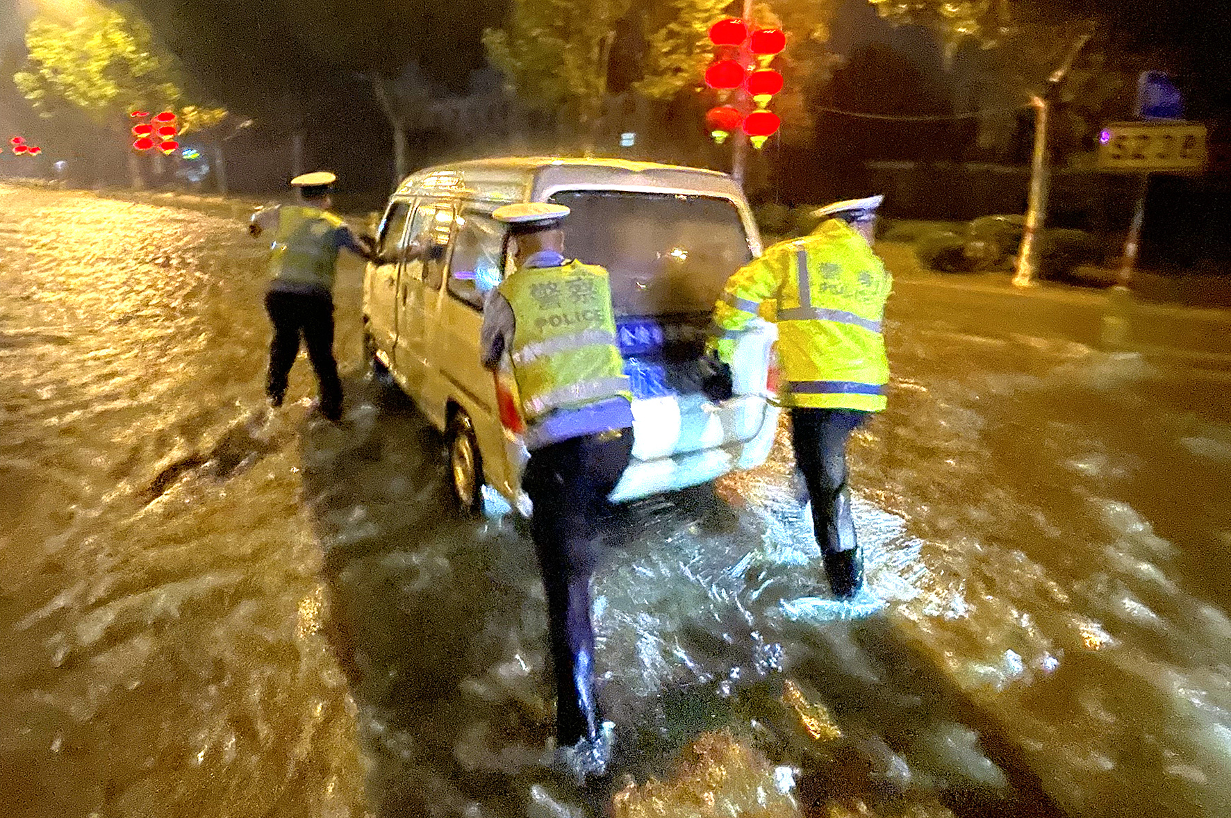7月8日,山東省棗莊市公安局高新交警大隊(duì)民輔警在轄區(qū)積水嚴(yán)重路段幫助被困車輛脫險(xiǎn)。